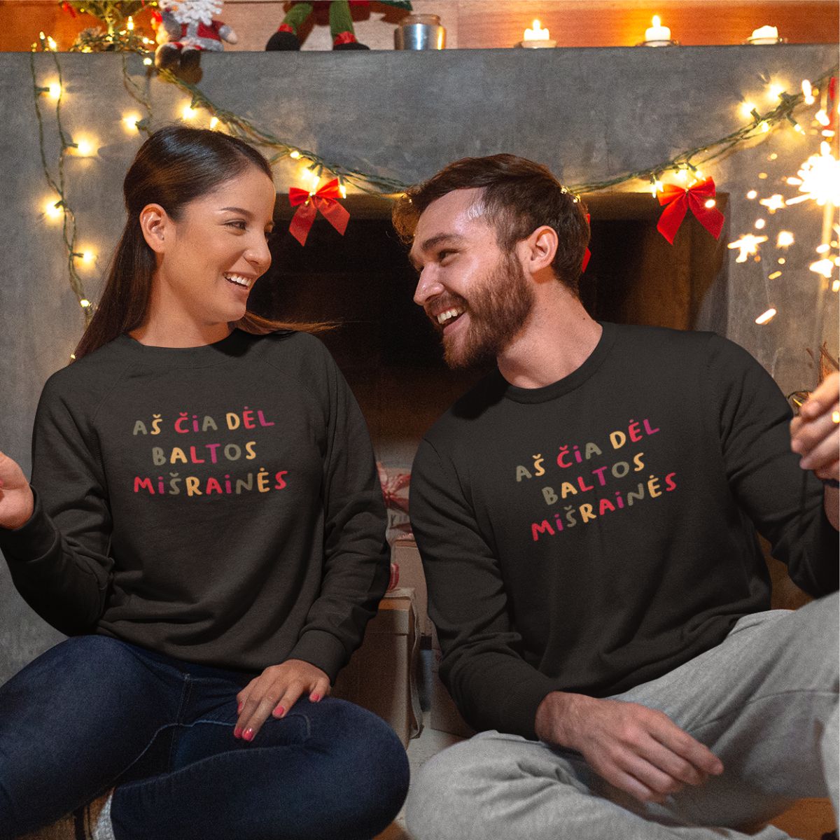 Juodi džemperiai be gobtuvų poroms „Aš čia dėl baltos mišrainės“