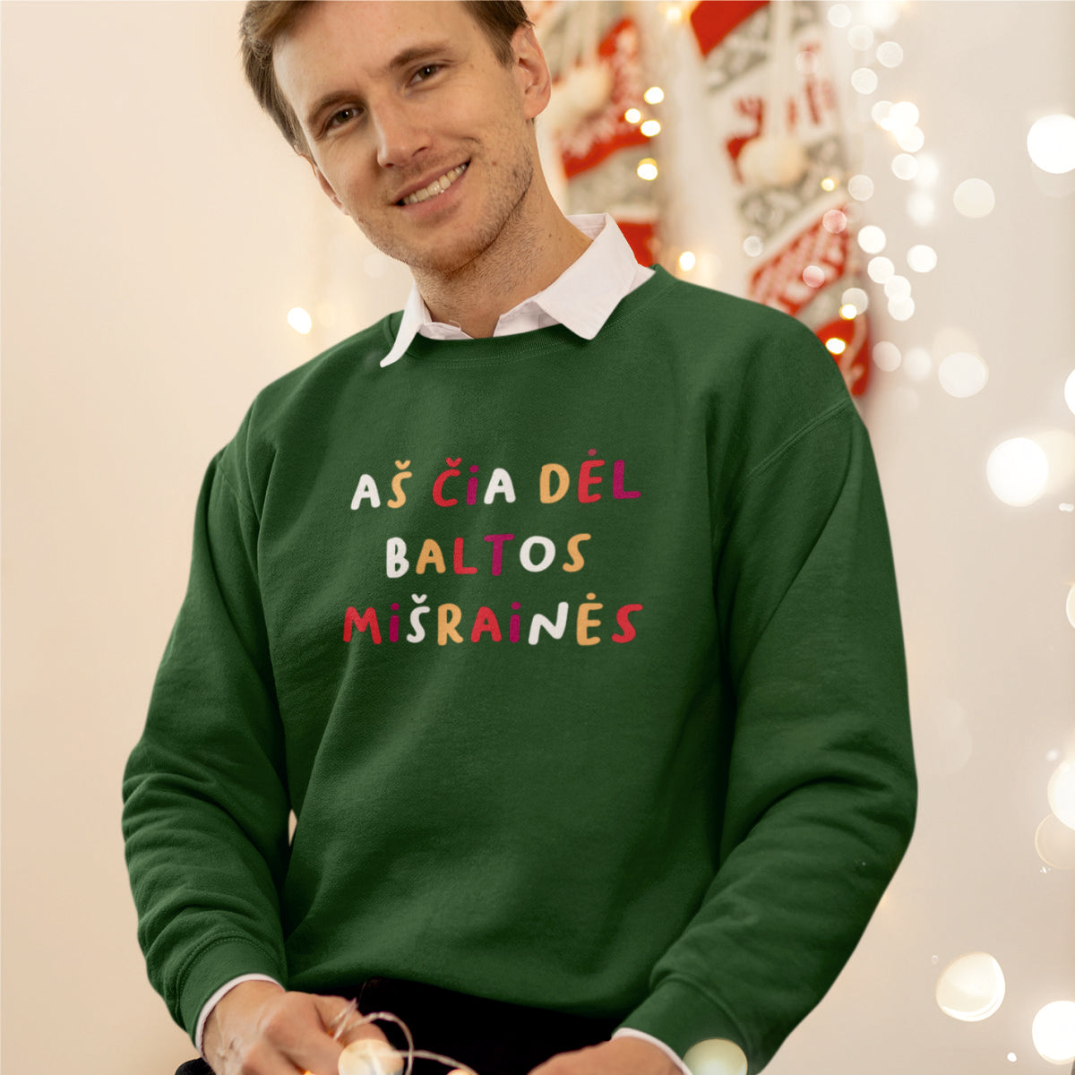 Tamsiai žalias kalėdinis UNISEX džemperis "Aš čia dėl baltos mišrainės"