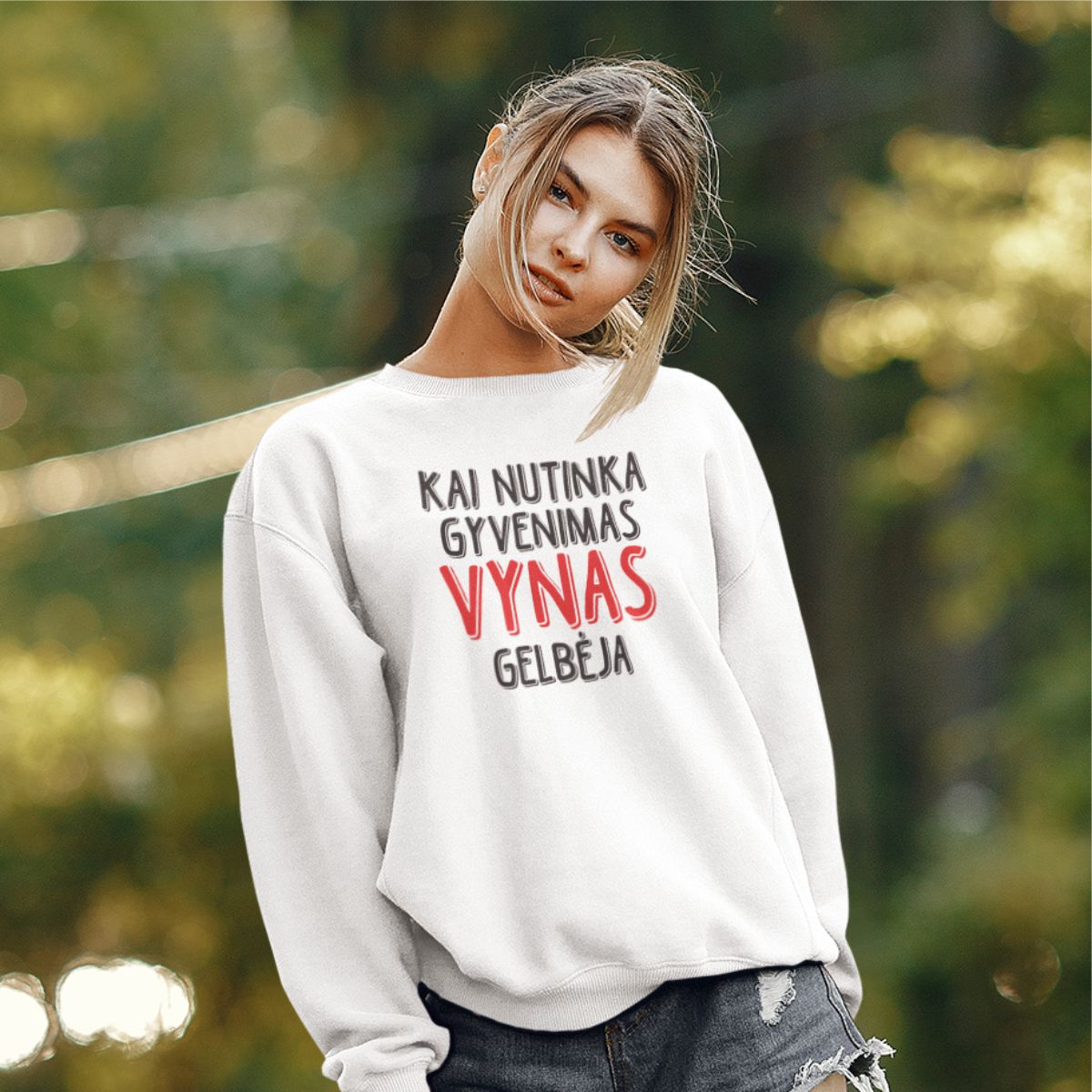 Baltas UNISEX džemperis be gobtuvo "Kai nutinka gyvenimas"