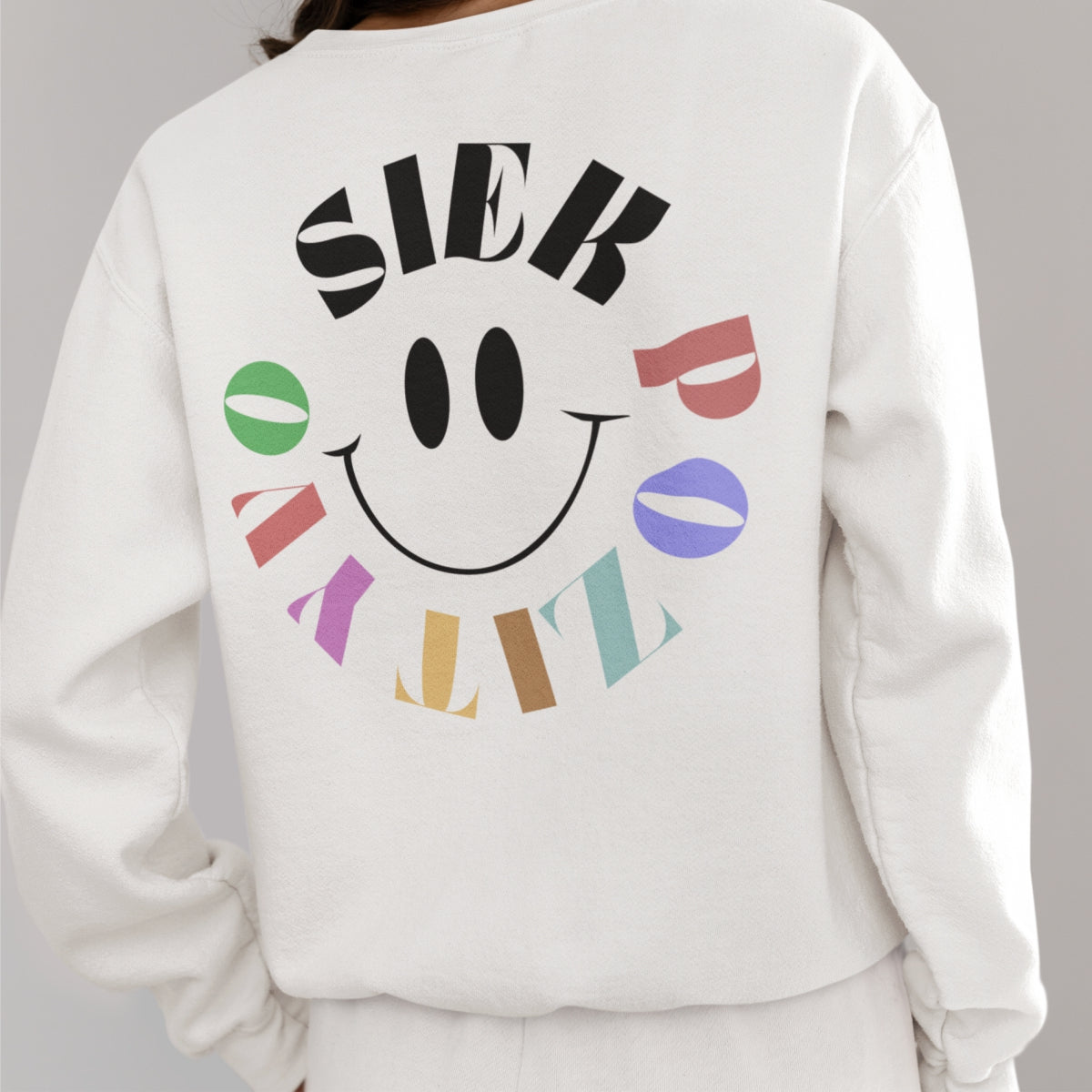 Baltas UNISEX džemperis su spauda ant nugaros "Siek pozityvo"