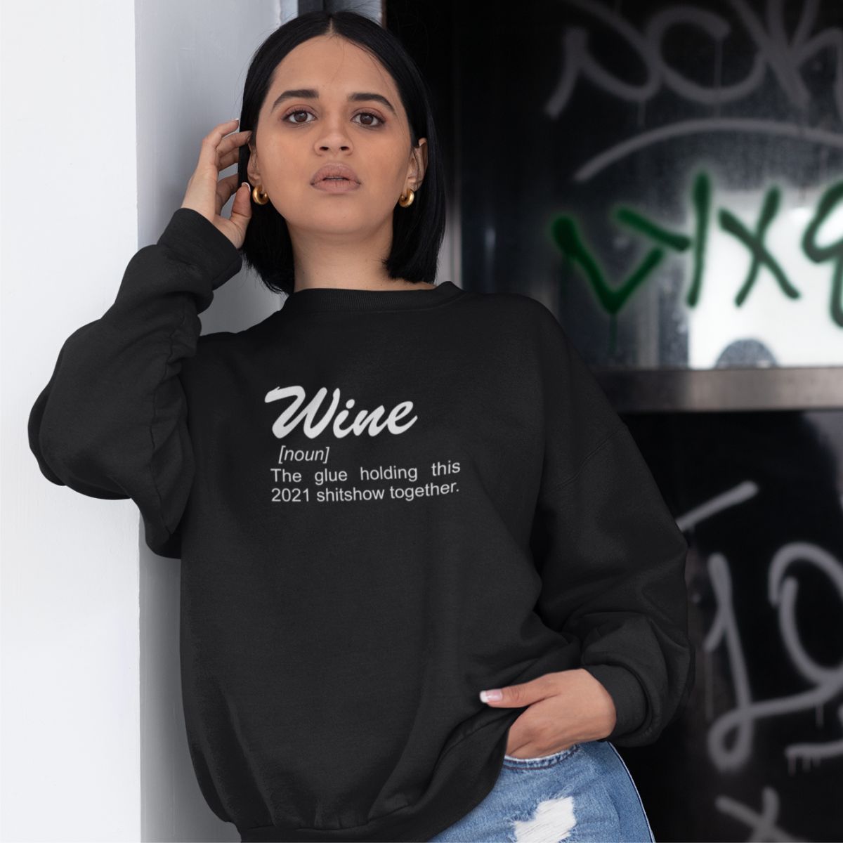 Juodas džemperis be gobtuvo "Wine is the glue"