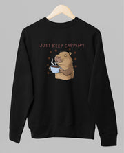 Juodas UNISEX džemperis be gobtuvo "Just keep cappin'"