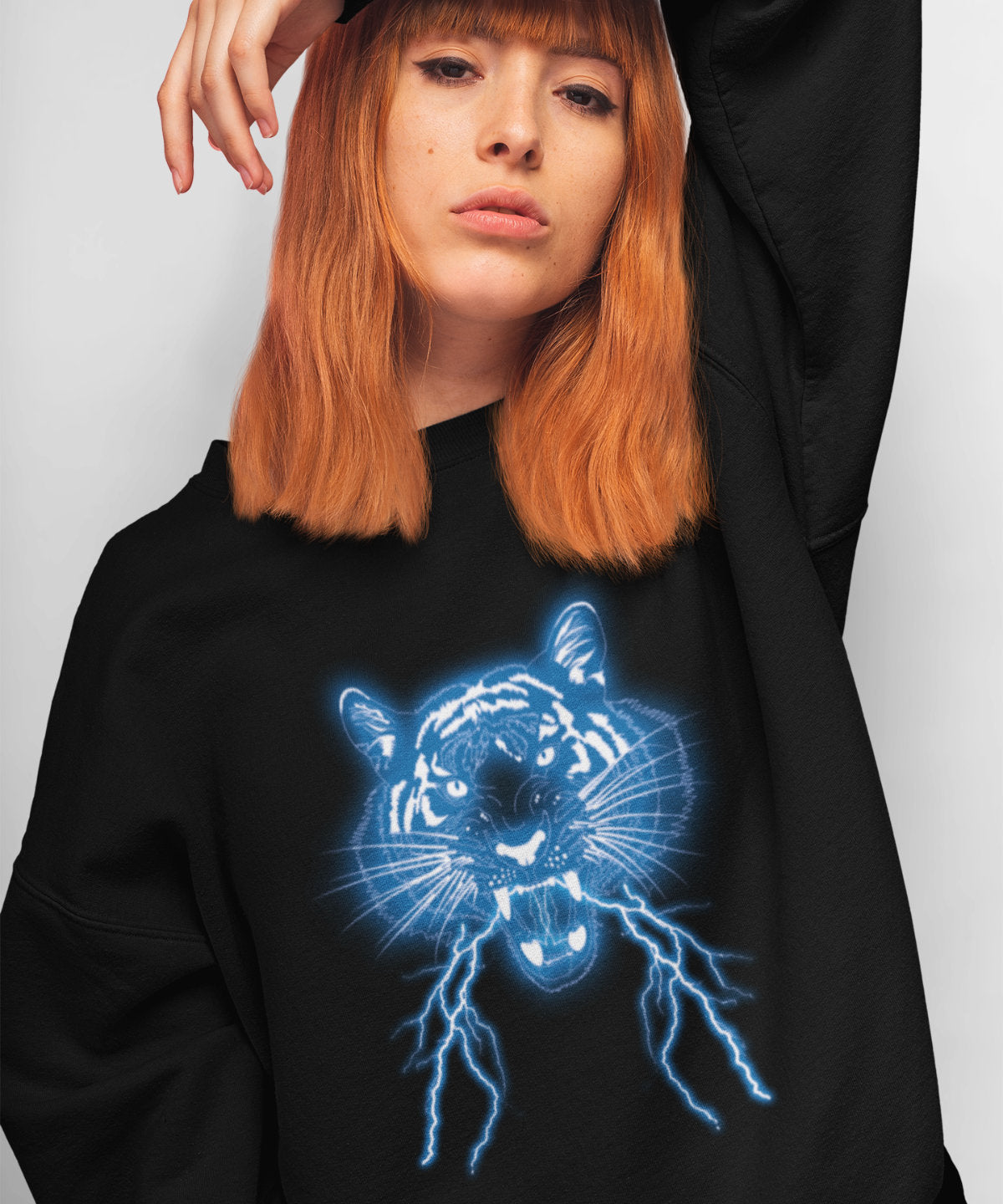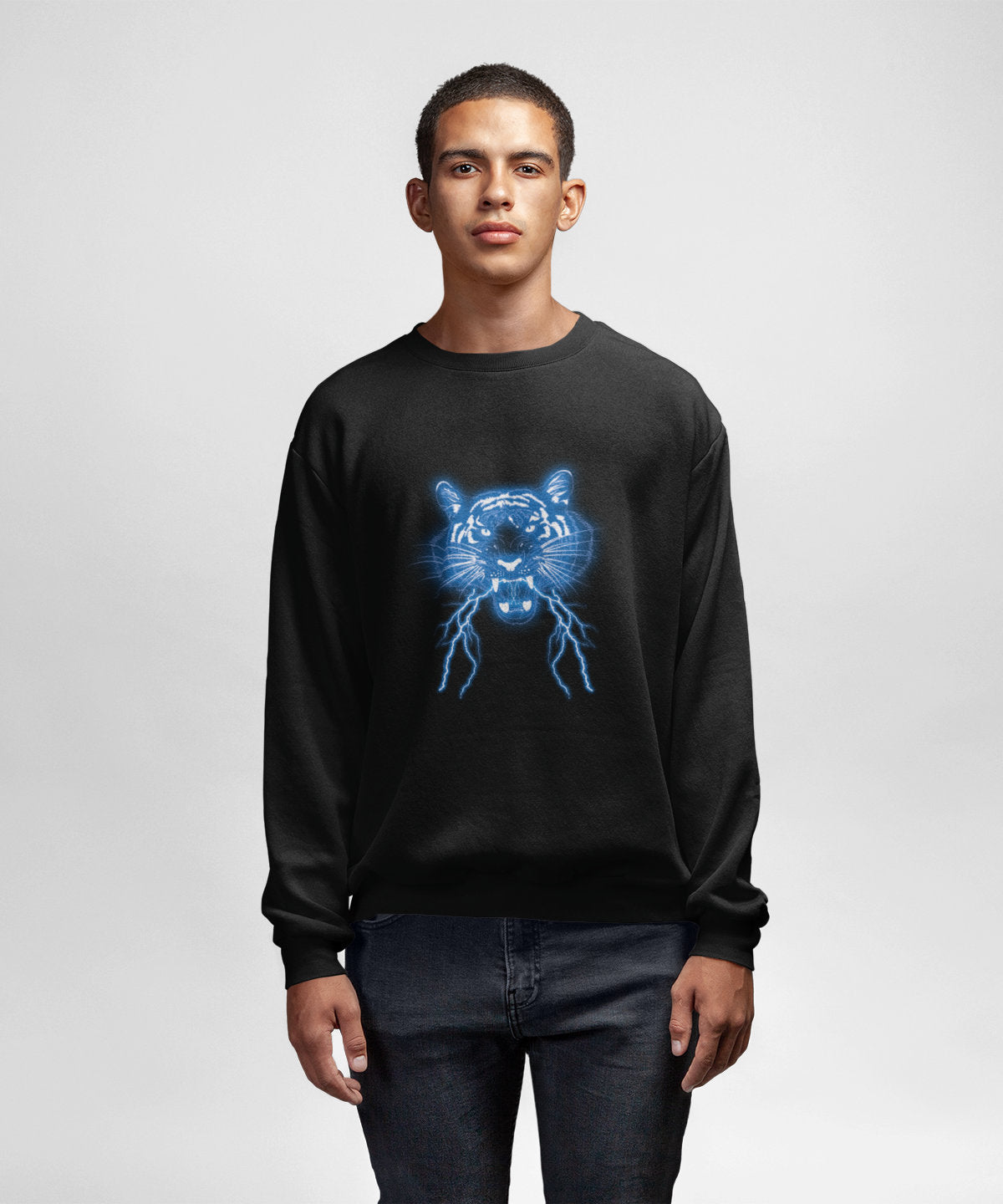 Juodas UNISEX džemperis be gobtuvo "Žaibų tigras"