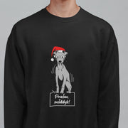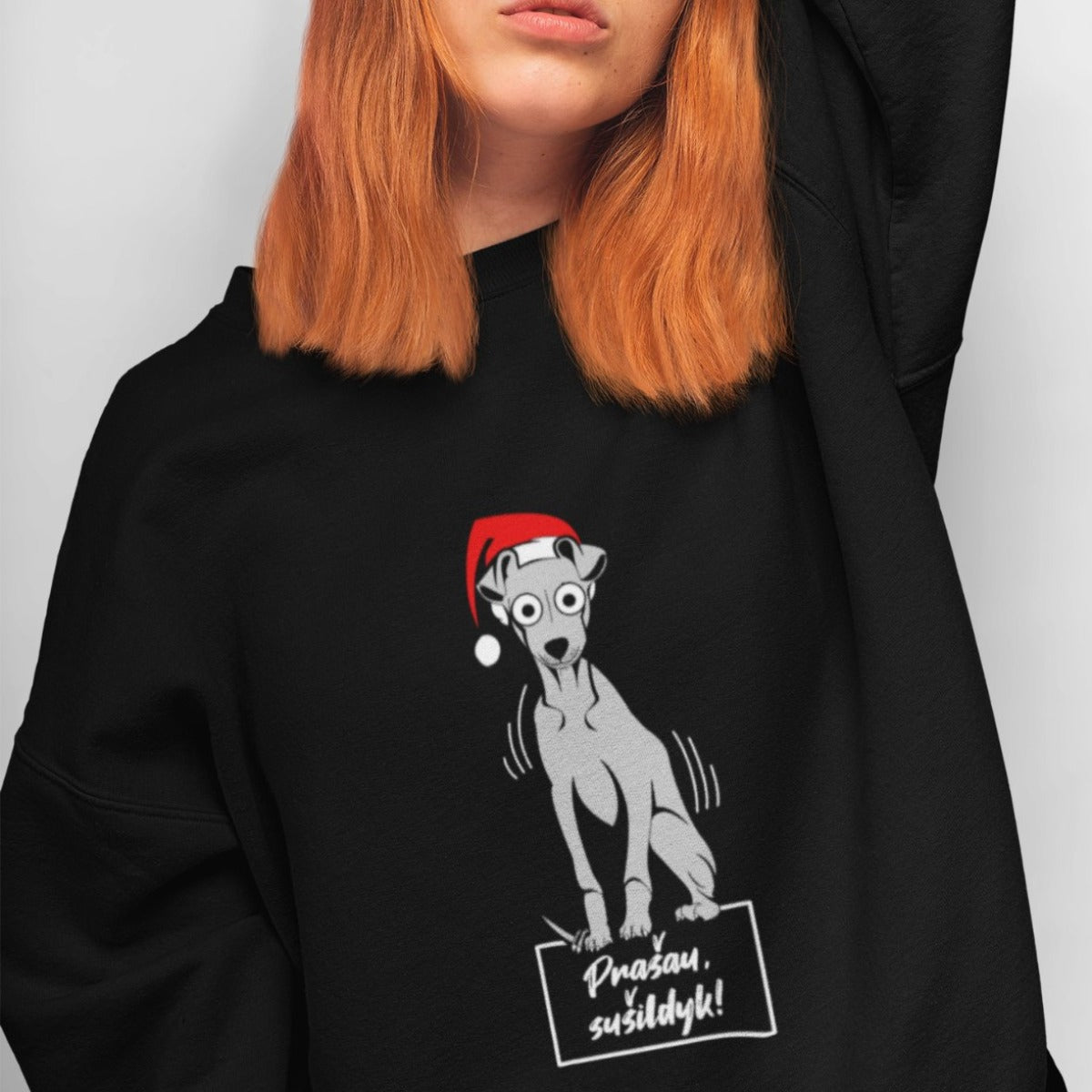 Juodas UNISEX kalėdinis džemperis be gobtuvo "Prašau sušildyk"