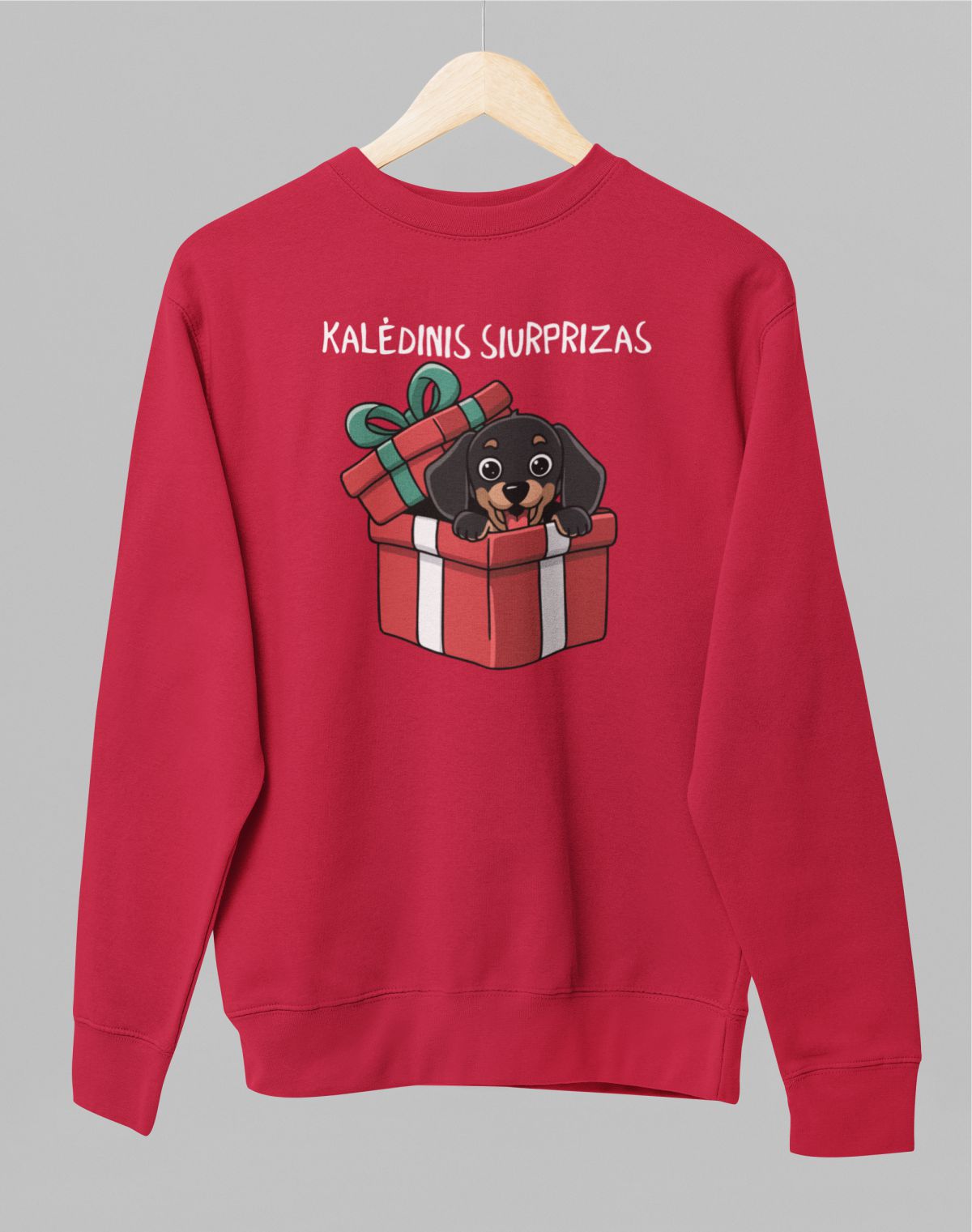 Raudonas UNISEX džemperis be gobtuvo "Kalėdinis siurprizas"