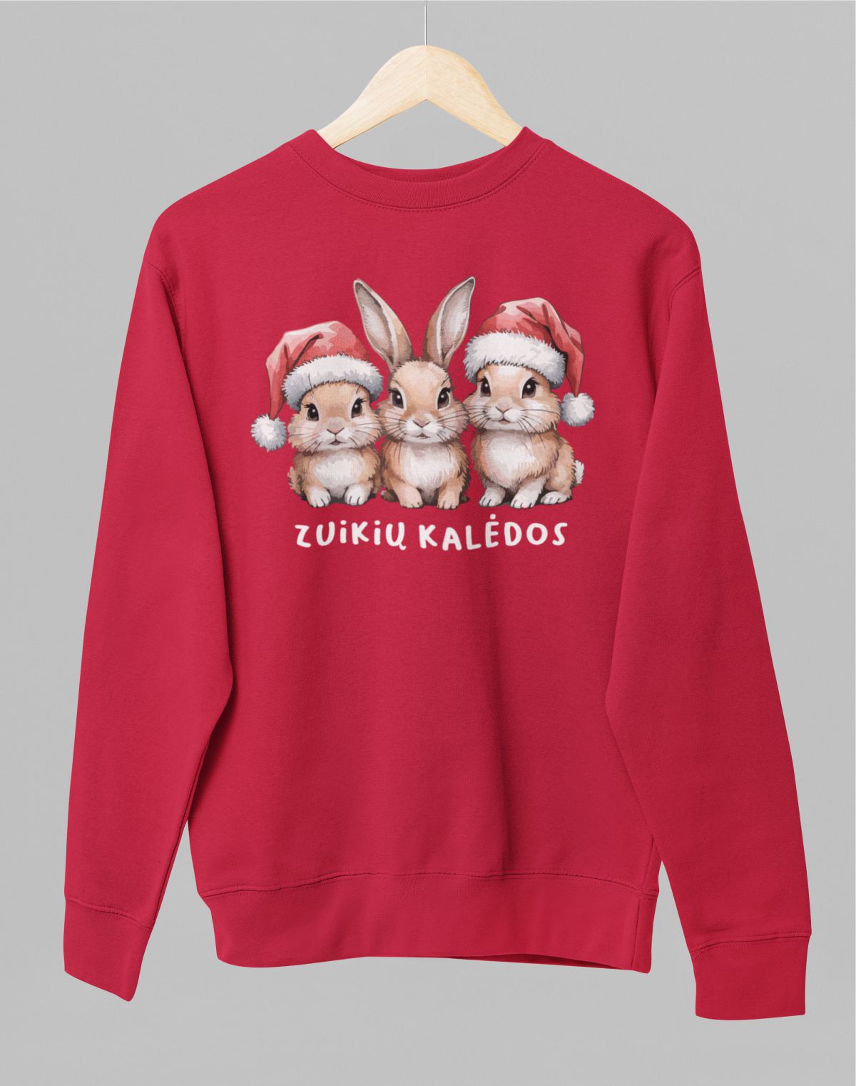 Raudonas UNISEX džemperis be gobtuvo "Zuikių Kalėdos"