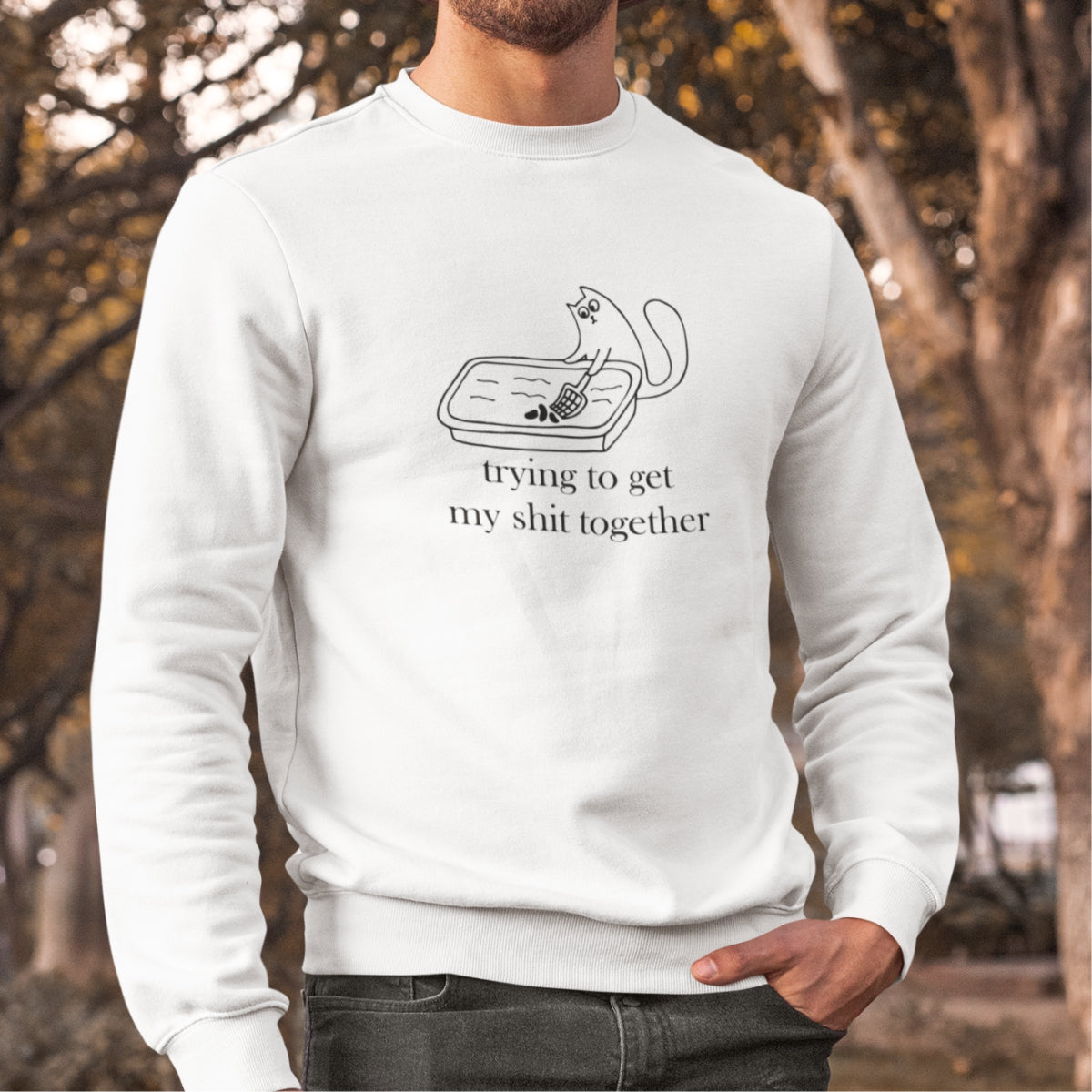 Baltas džemperis be gobtuvo "Trying to get my shit together"