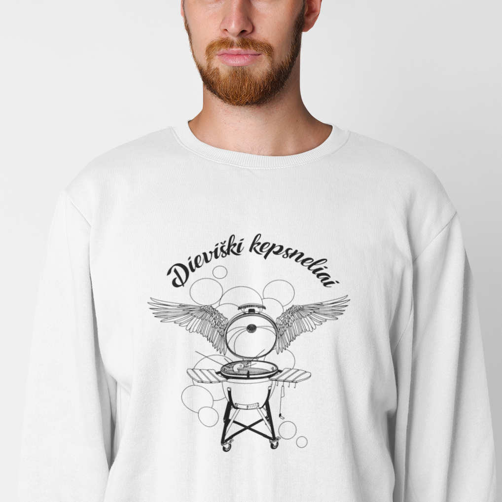 Baltas UNISEX džemperis be gobtuvo "Dieviški kepsneliai"