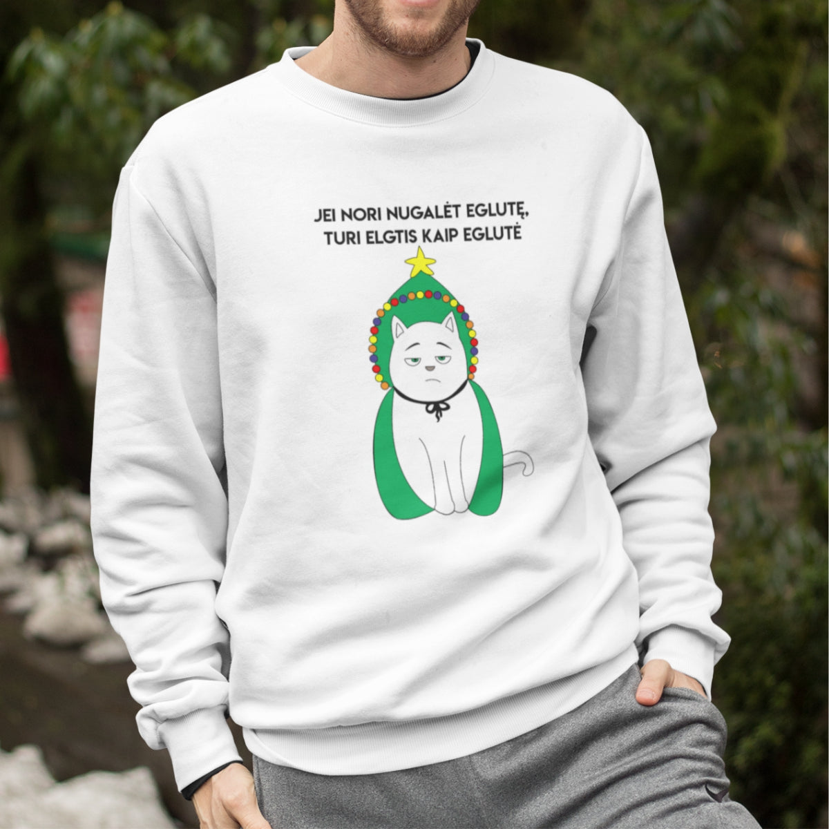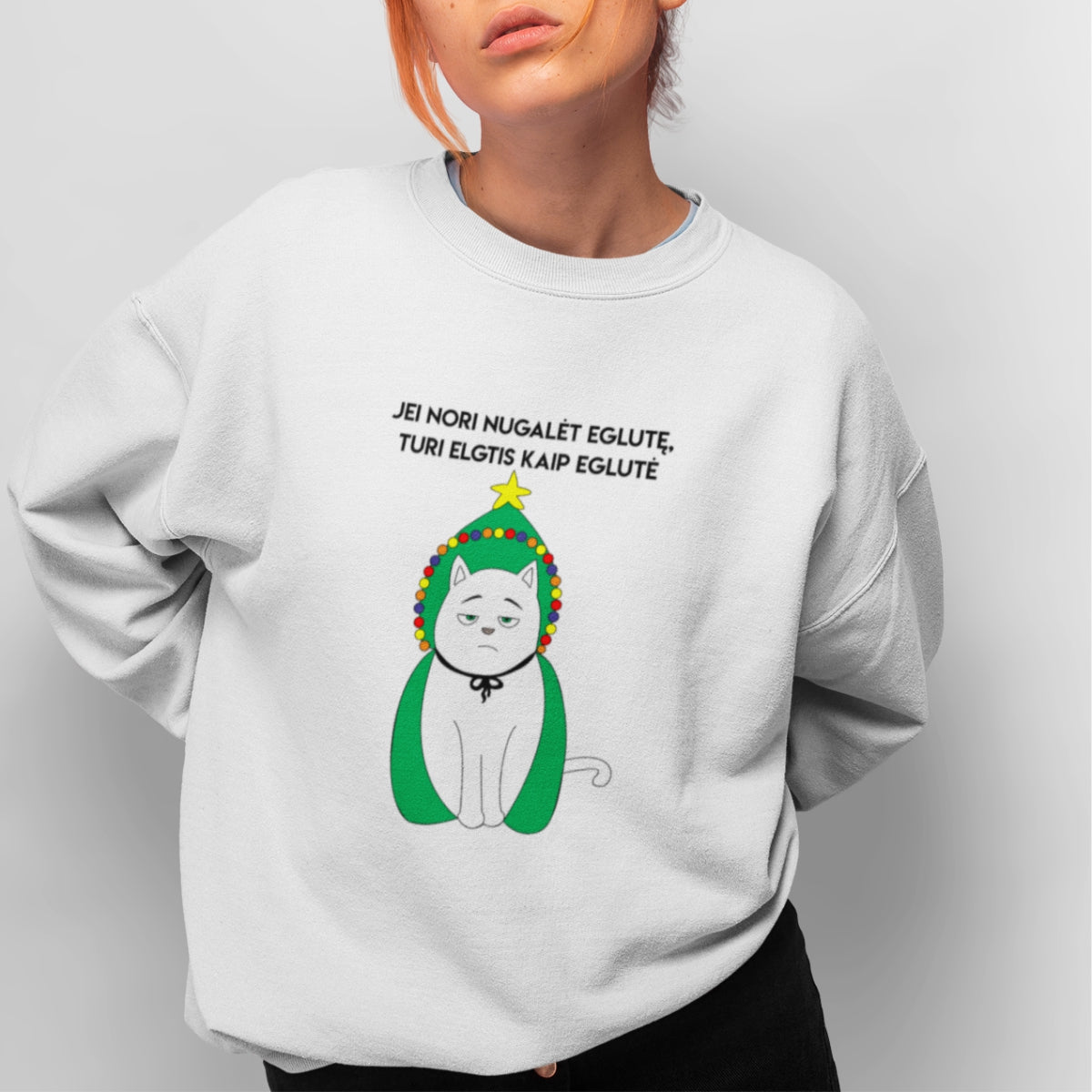 Baltas UNISEX džemperis be gobtuvo "Jei nori nugalėti eglutę"