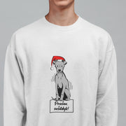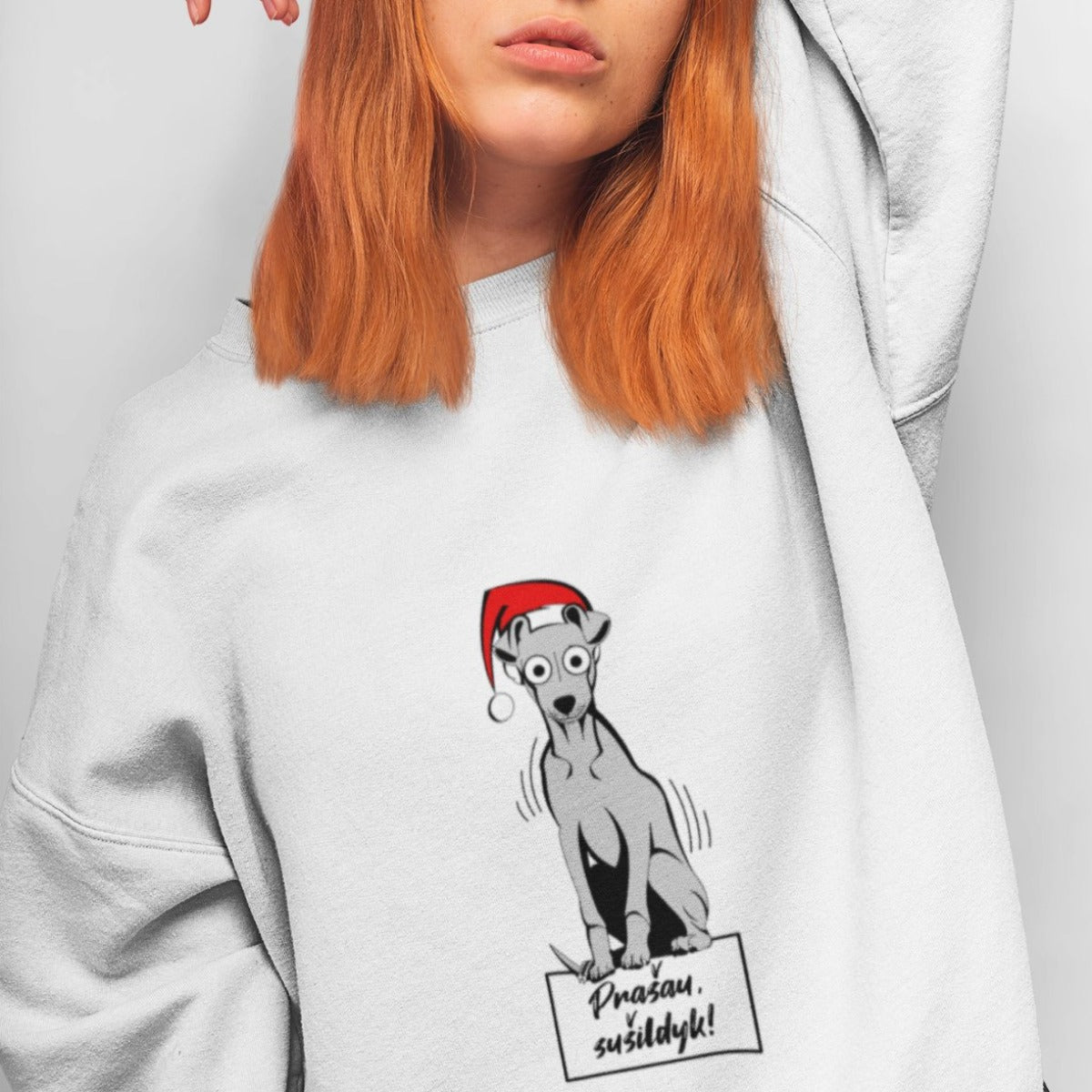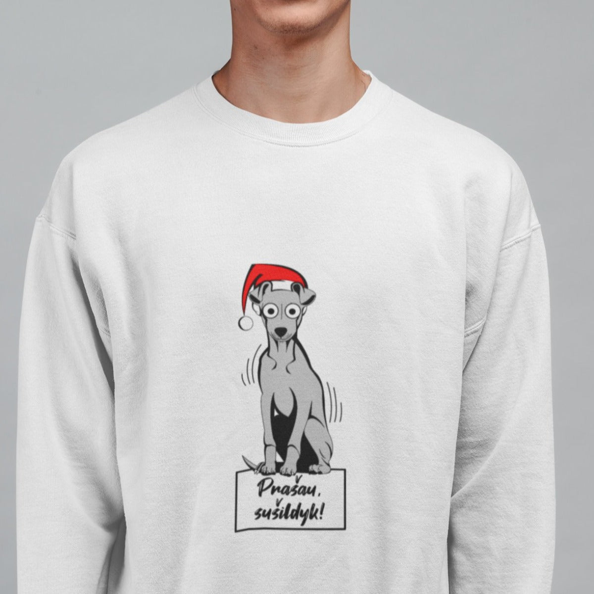 Baltas UNISEX kalėdinis džemperis be gobtuvo "Prašau sušildyk"