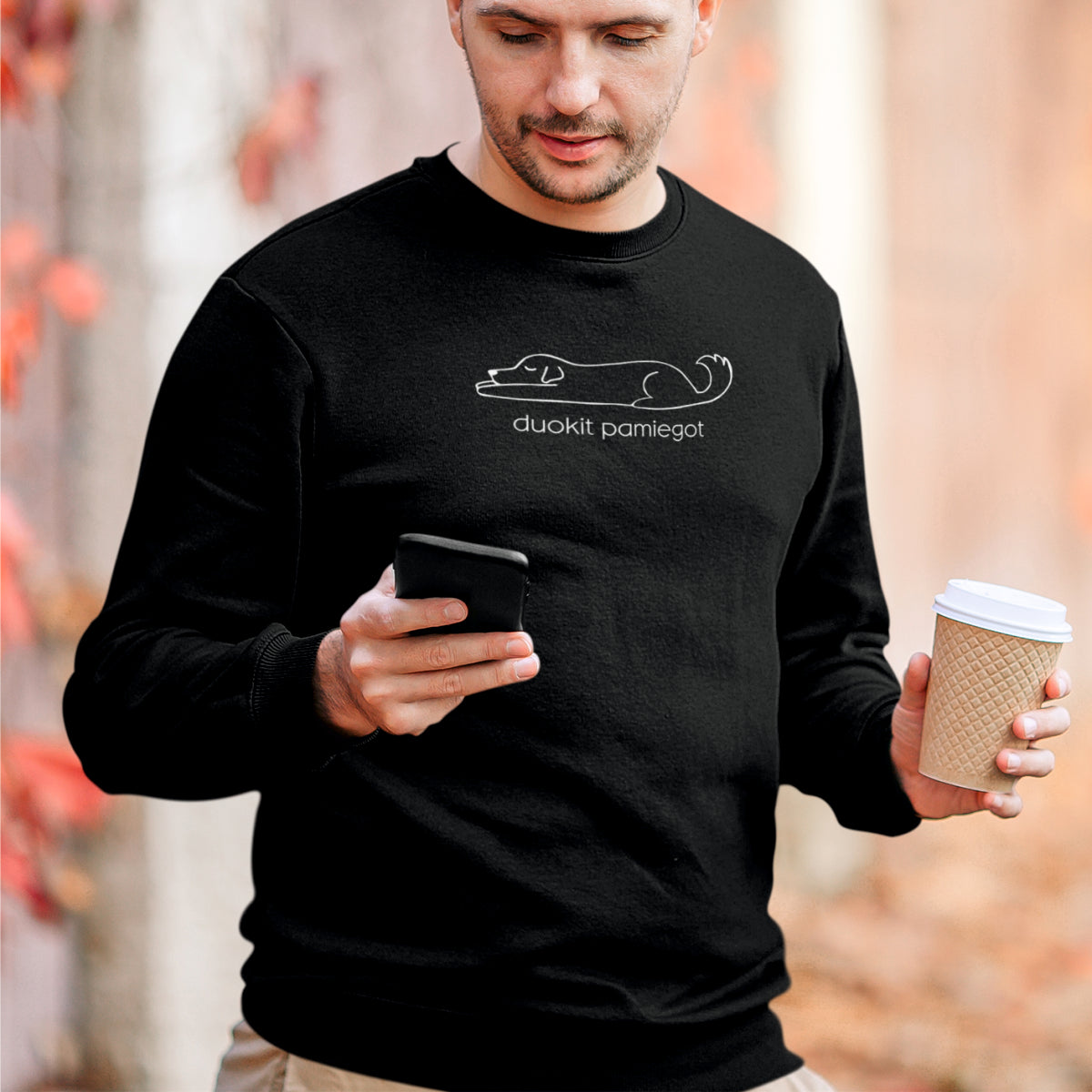 Juodas džemperis be gobtuvo "Duokit pamiegot"