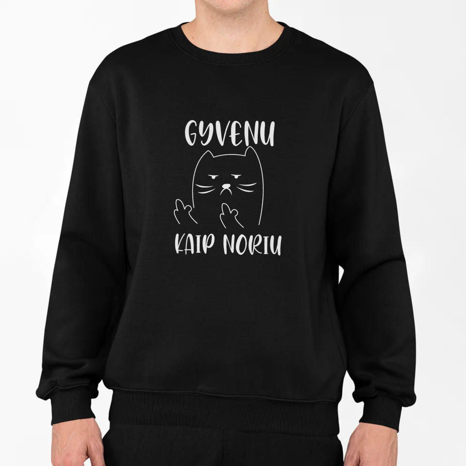 Juodas džemperis be gobtuvo "Gyvenu kaip noriu" (M dydis). Pagaminta prekė. Greitas išsiuntimas!