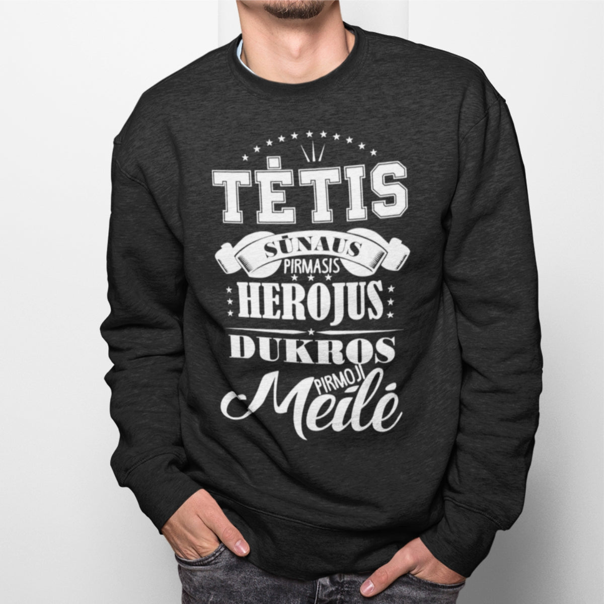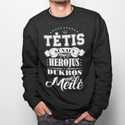 Juodas džemperis be gobtuvo su baltu užrašu "Tėtis - herojus"
