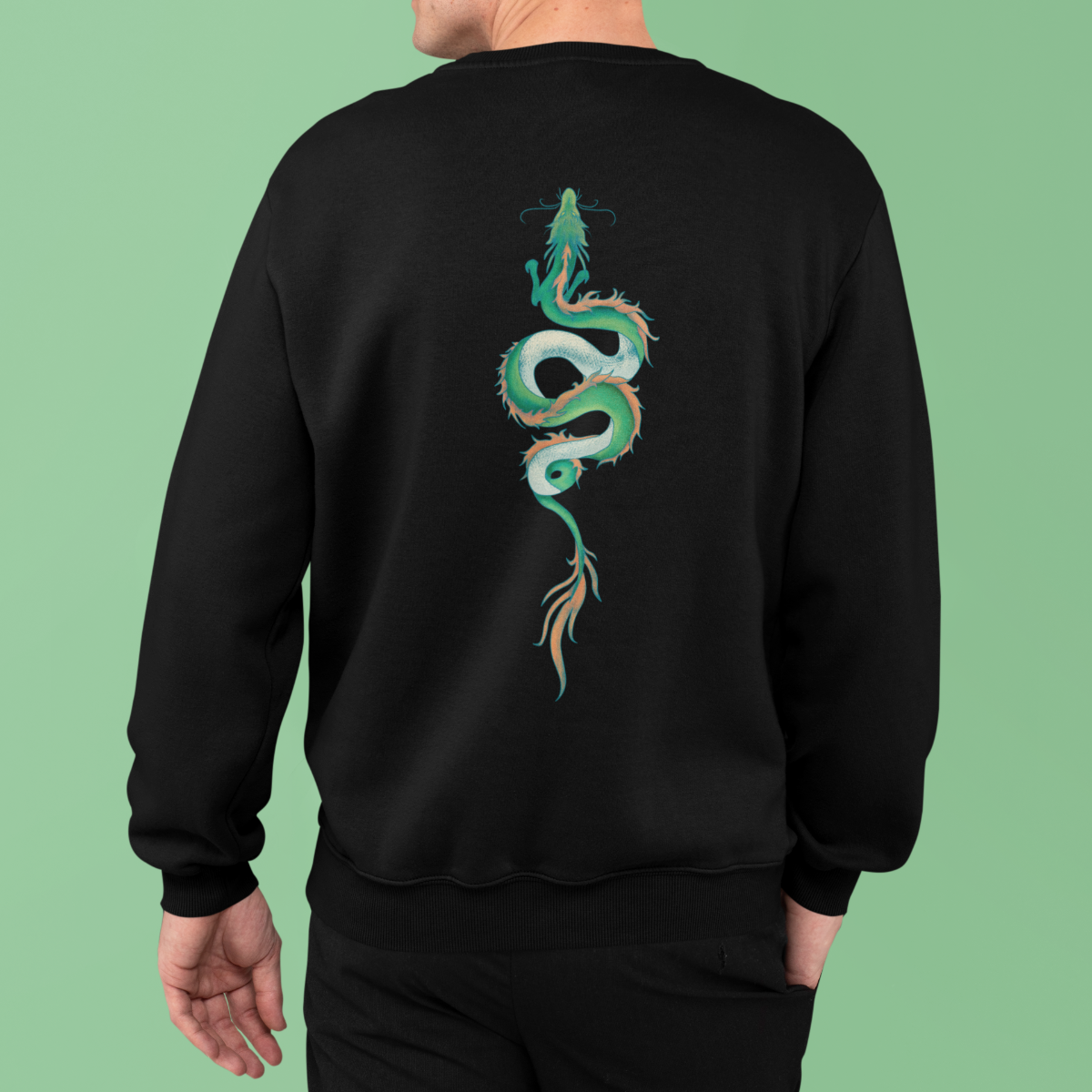 Juodas džemperis be gobtuvo su spauda ant nugaros "Drakono metai"