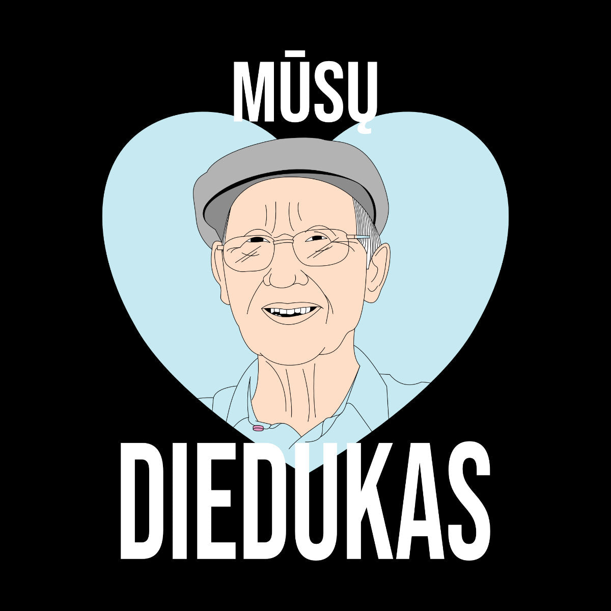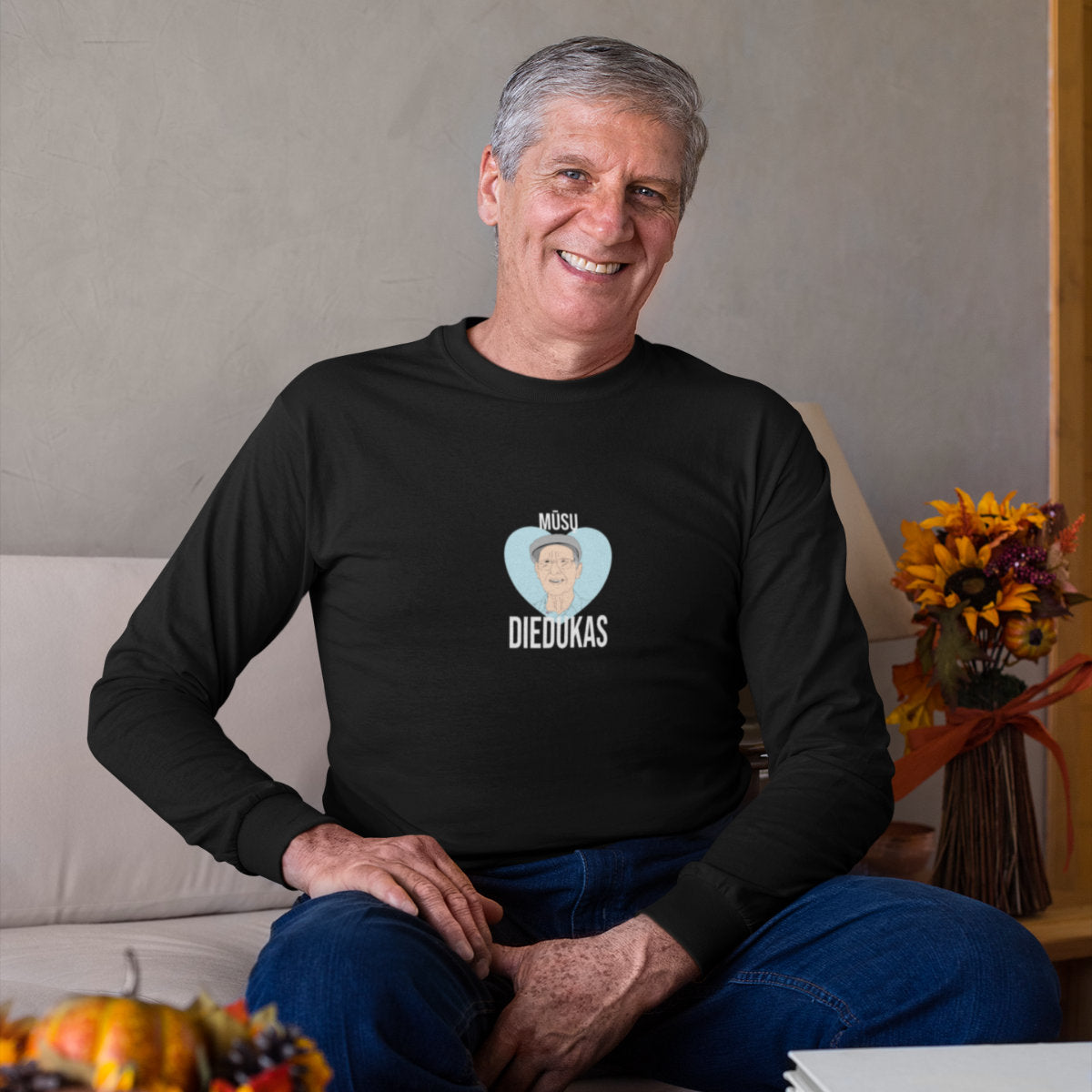 Juodas džemperis be gobtuvo su užrašu "Mūsų diedukas"
