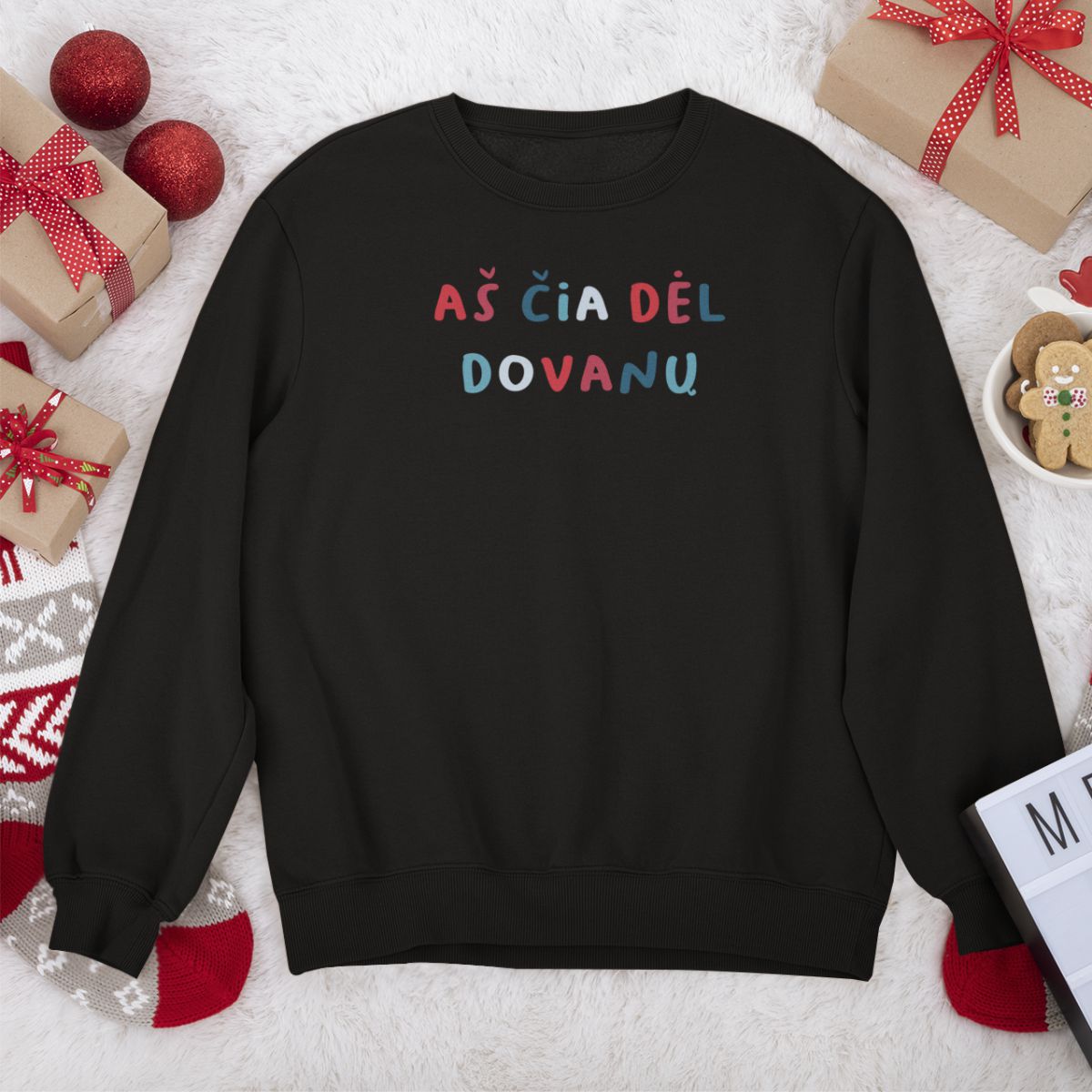 Juodas kalėdinis UNISEX džemperis "Aš čia dėl dovanų"