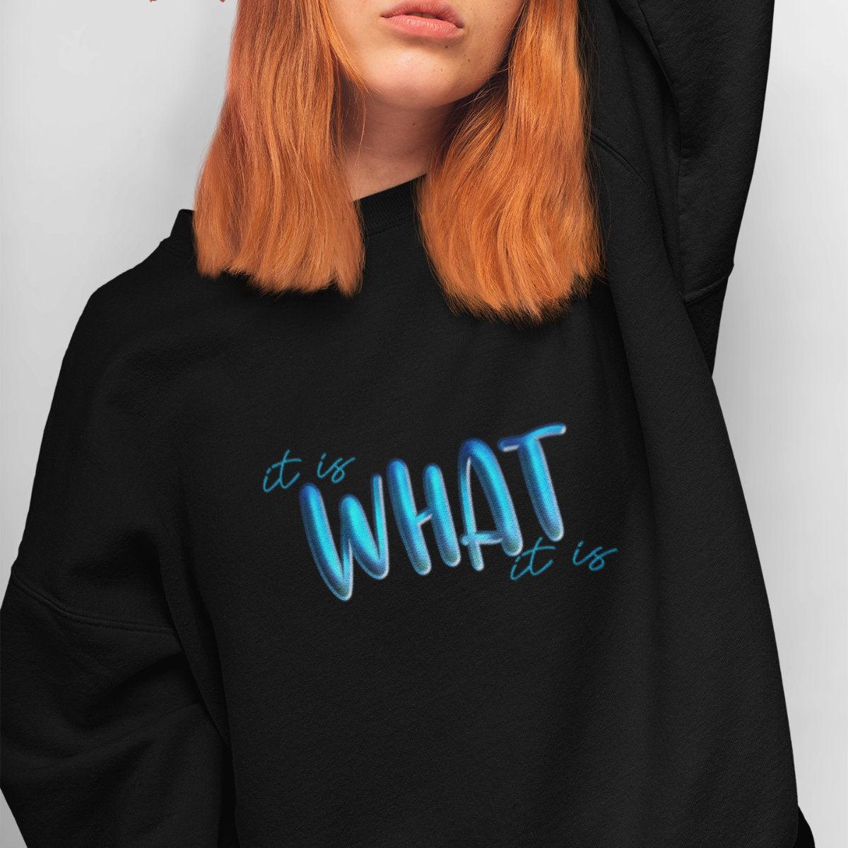 Juodas UNISEX džemperis be gobtuvo "It is what it is"