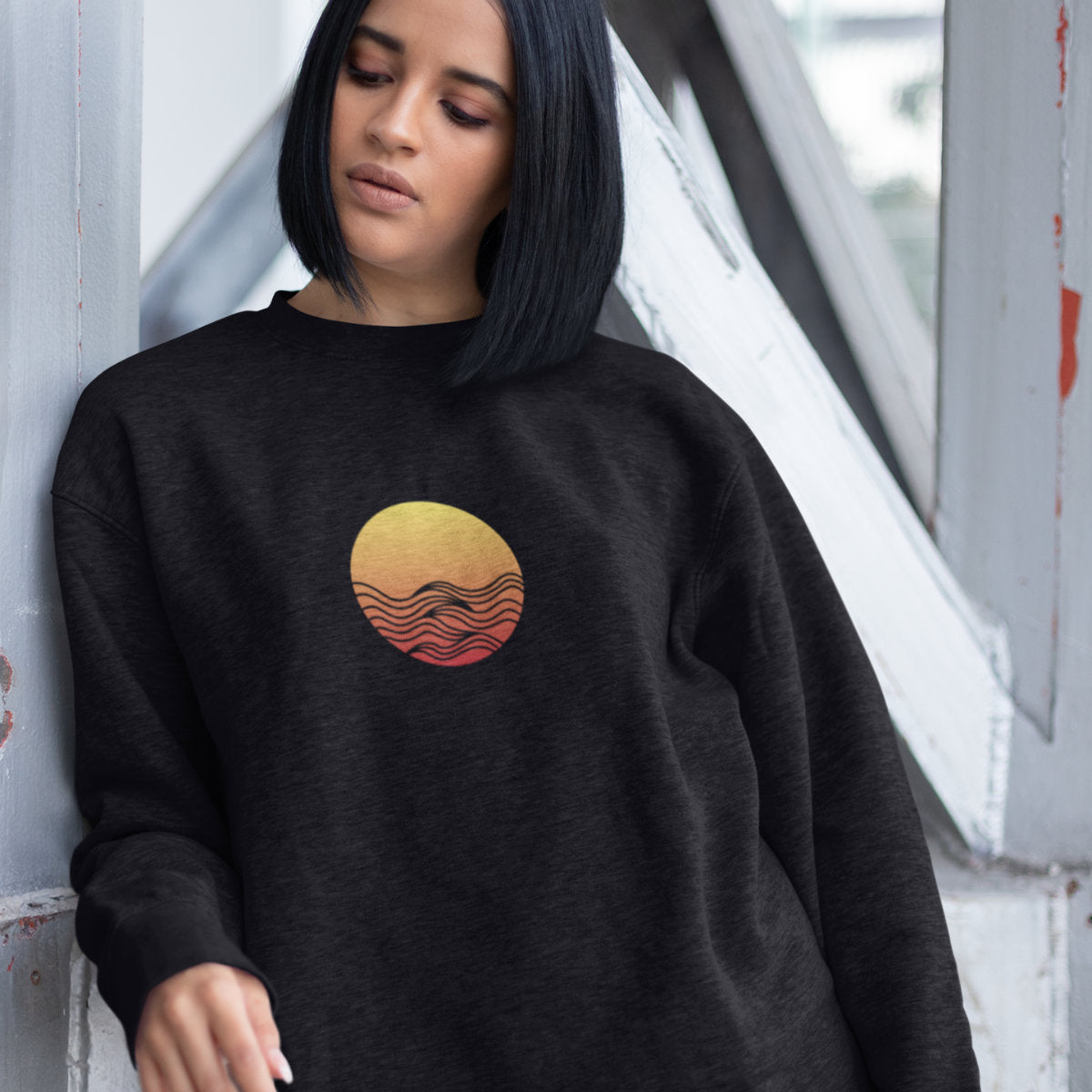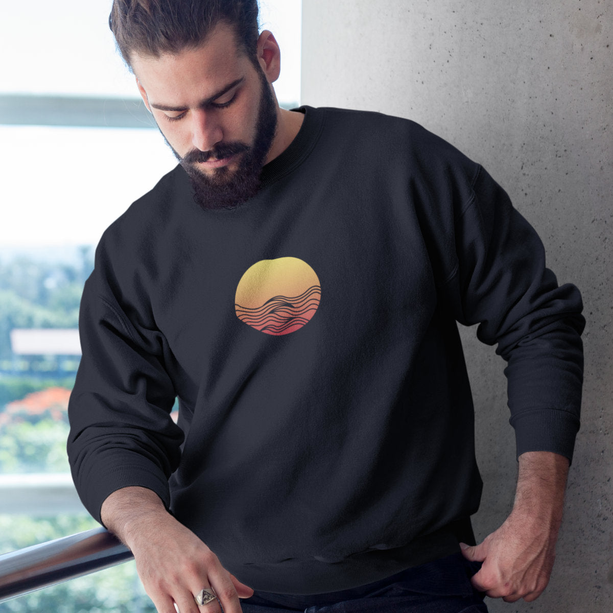 Juodas UNISEX džemperis be gobtuvo "Saulėlydis"