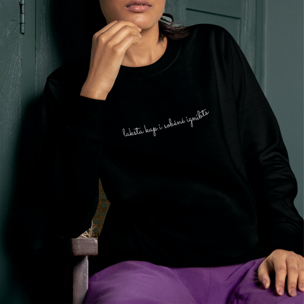Juodas UNISEX džemperis be gobtuvo su žemaitišku užrašu "Laksta kap i sobene ignibts"