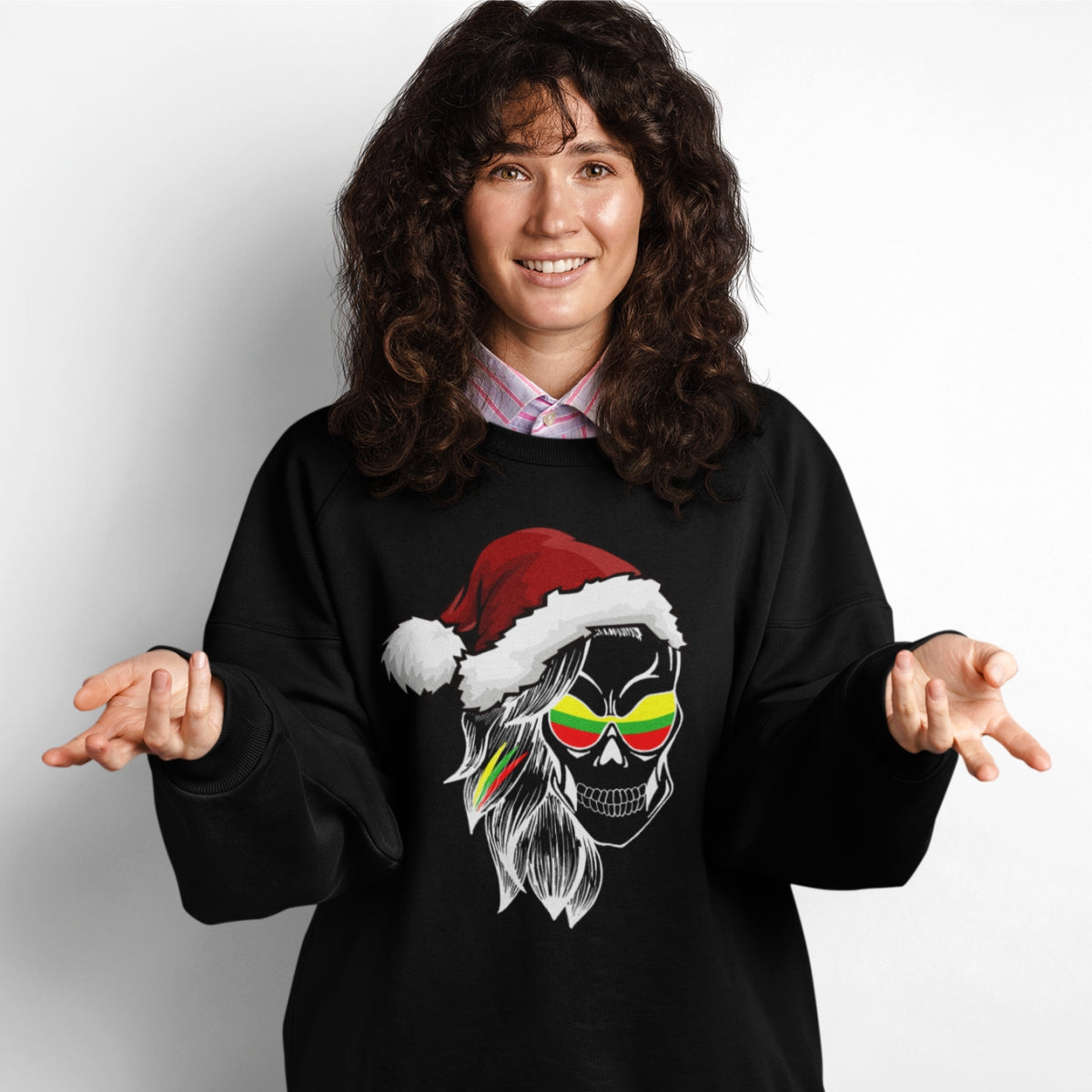 Juodas UNISEX kalėdinis džemperis be gobtuvo "Kalėdinė moteriška kaukolė"
