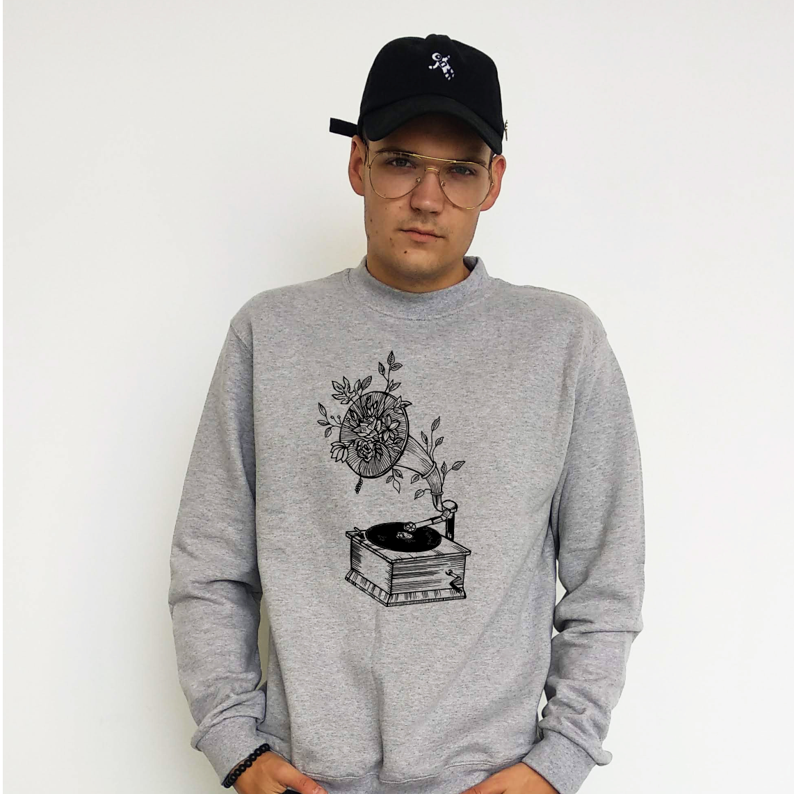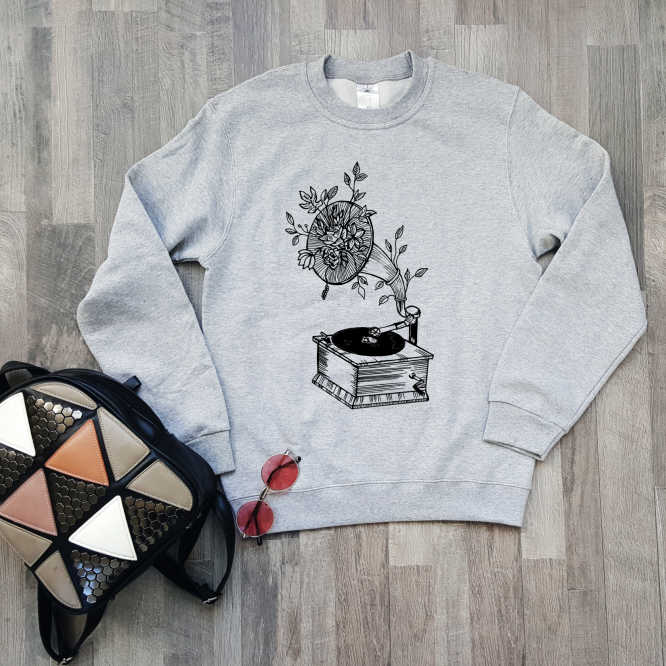 Pilkas džemperis be gobtuvo "Gramofonas“