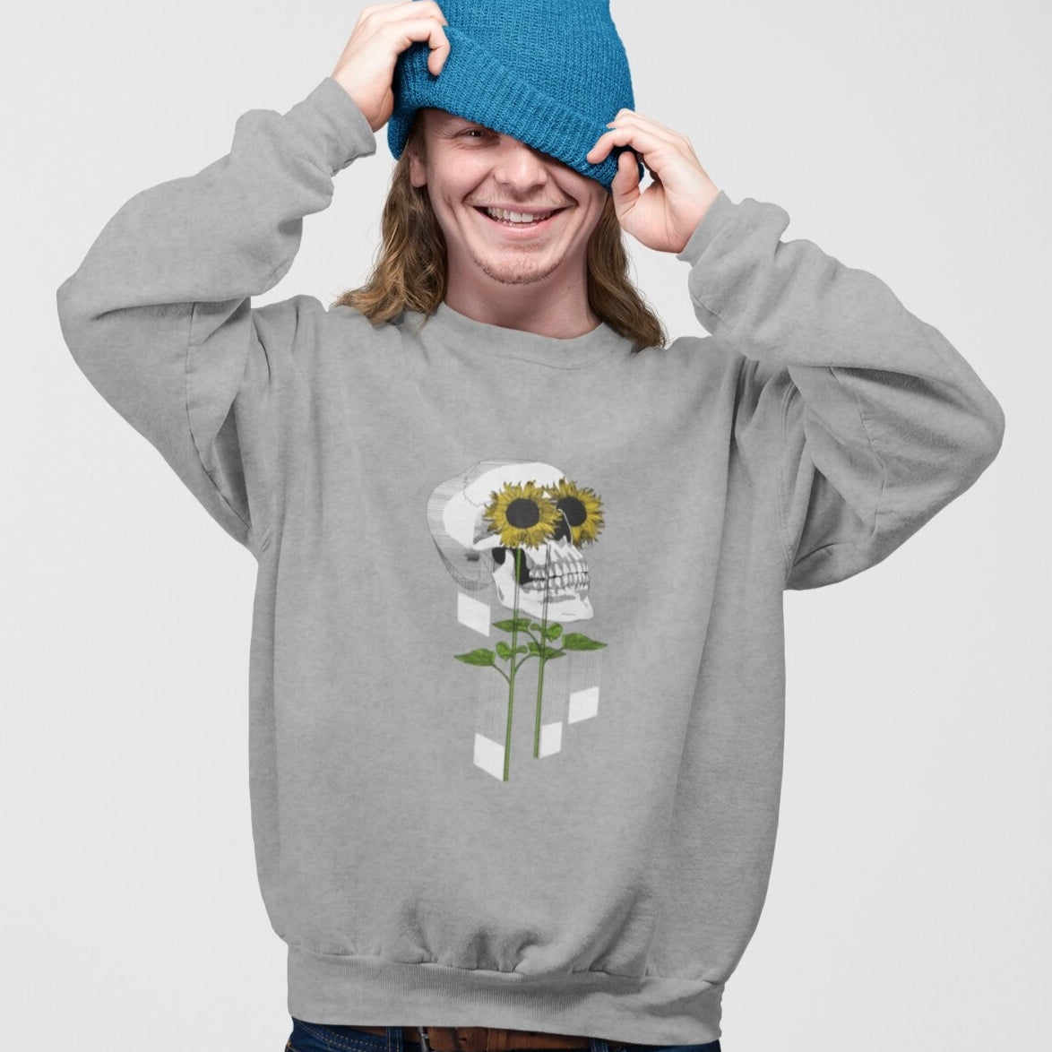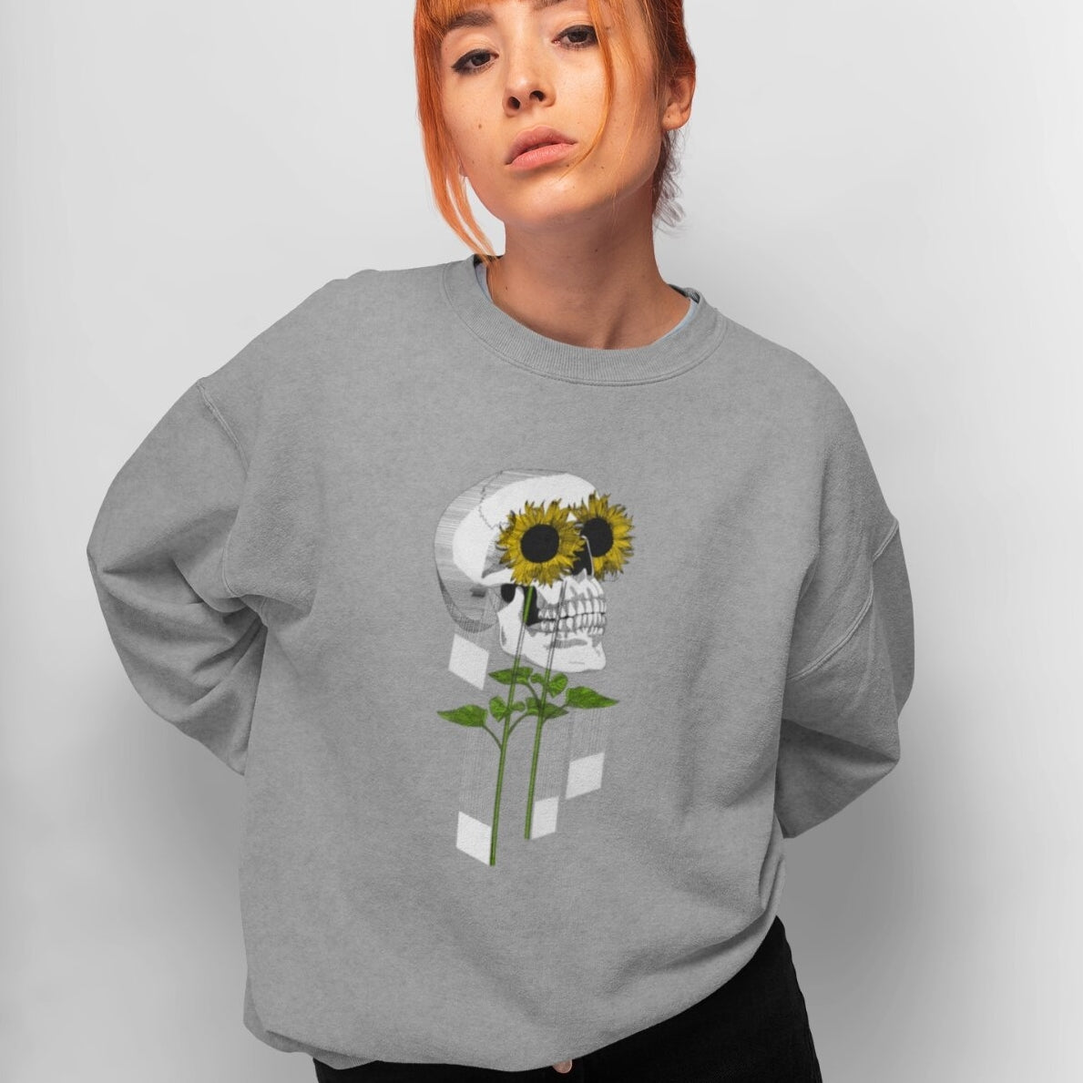 Pilkas džemperis be gobtuvo "Kaukolė su geltonom saulėgrąžom"