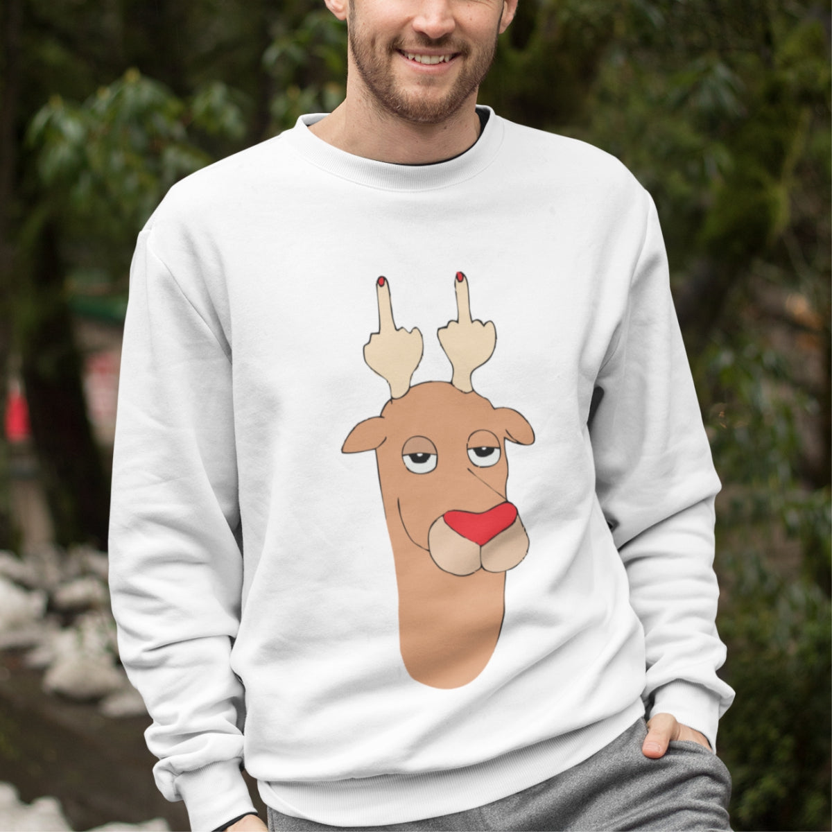 Baltas džemperis be gobtuvo "Linksmas briedis"