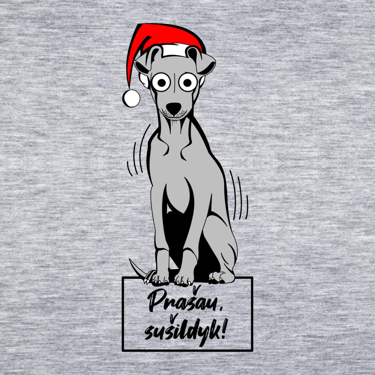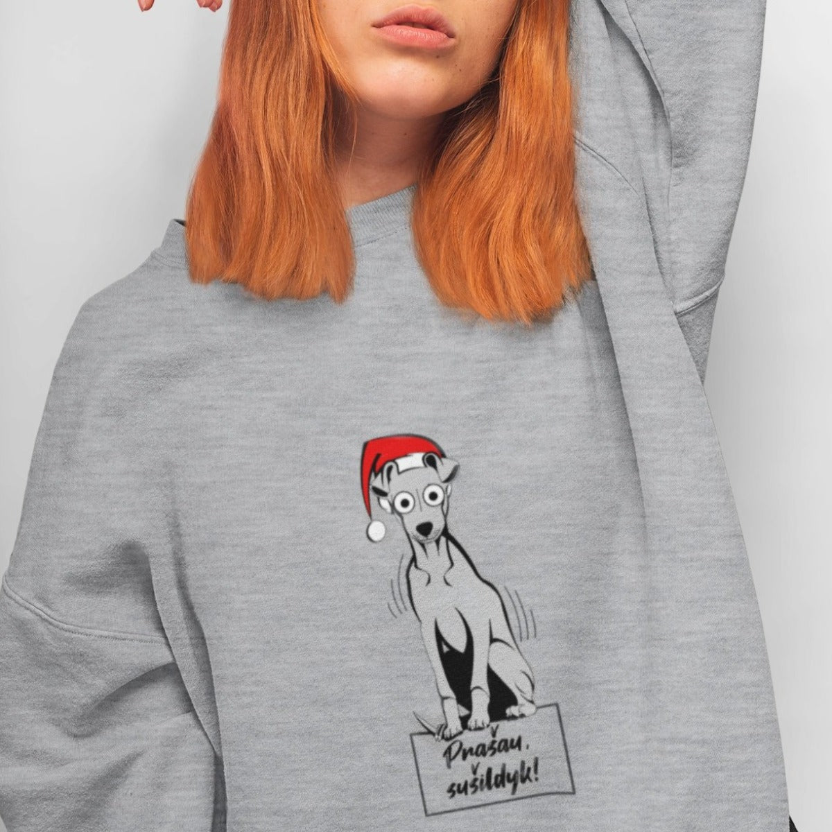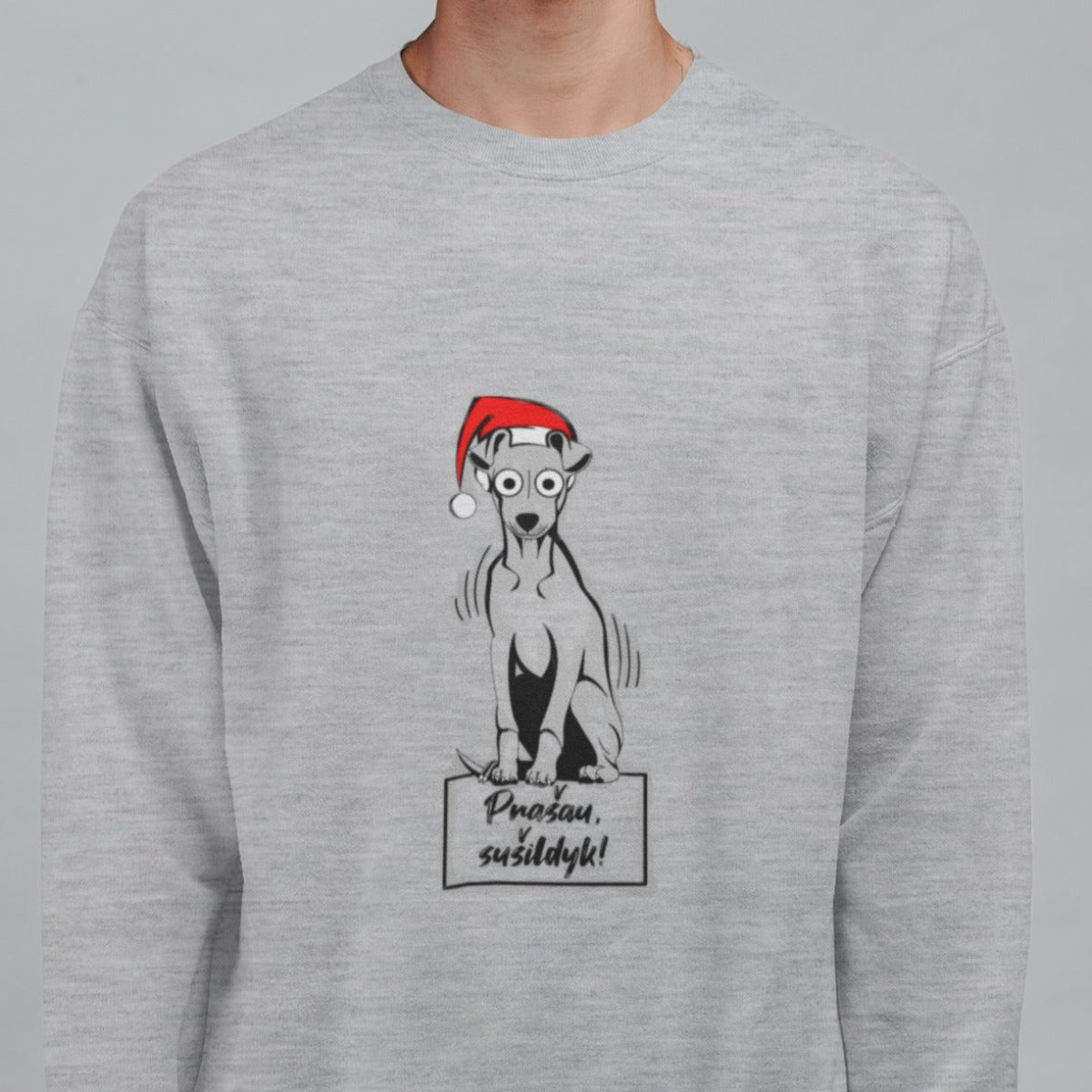 Pilkas melanžinis UNISEX kalėdinis džemperis be gobtuvo "Prašau sušildyk"