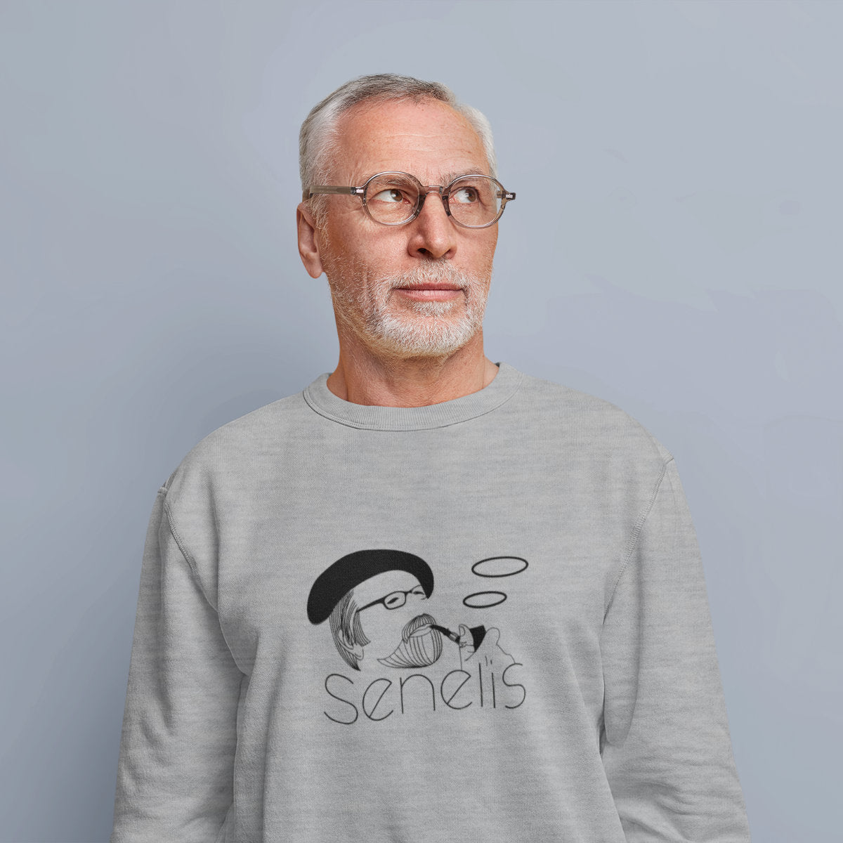 Pilkas melanžinis džemperis be gobtuvo su užrašu "Senelis su pypke"