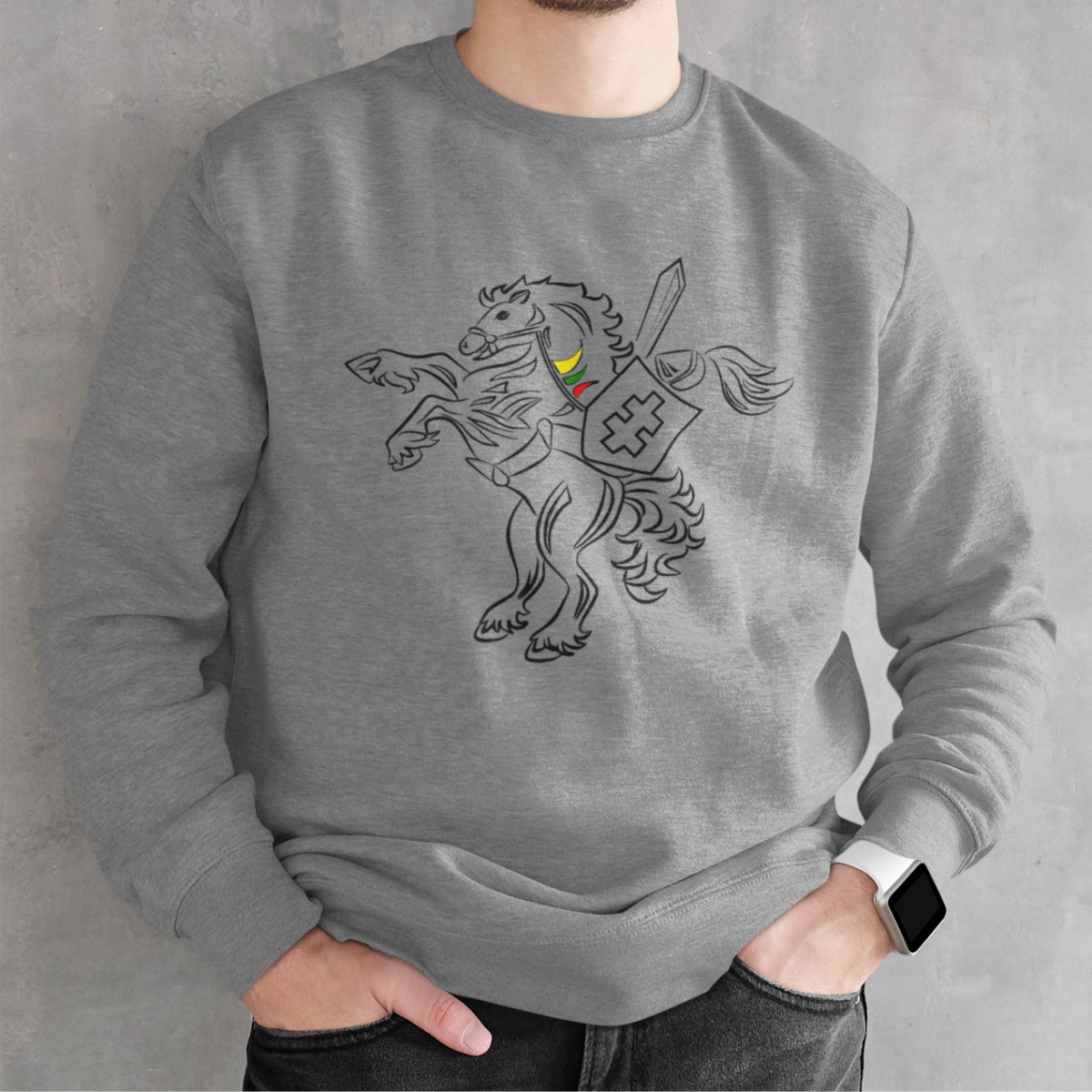 Pilkas melanžinis UNISEX džemperis be gobtuvo "Kovojantis Vytis"