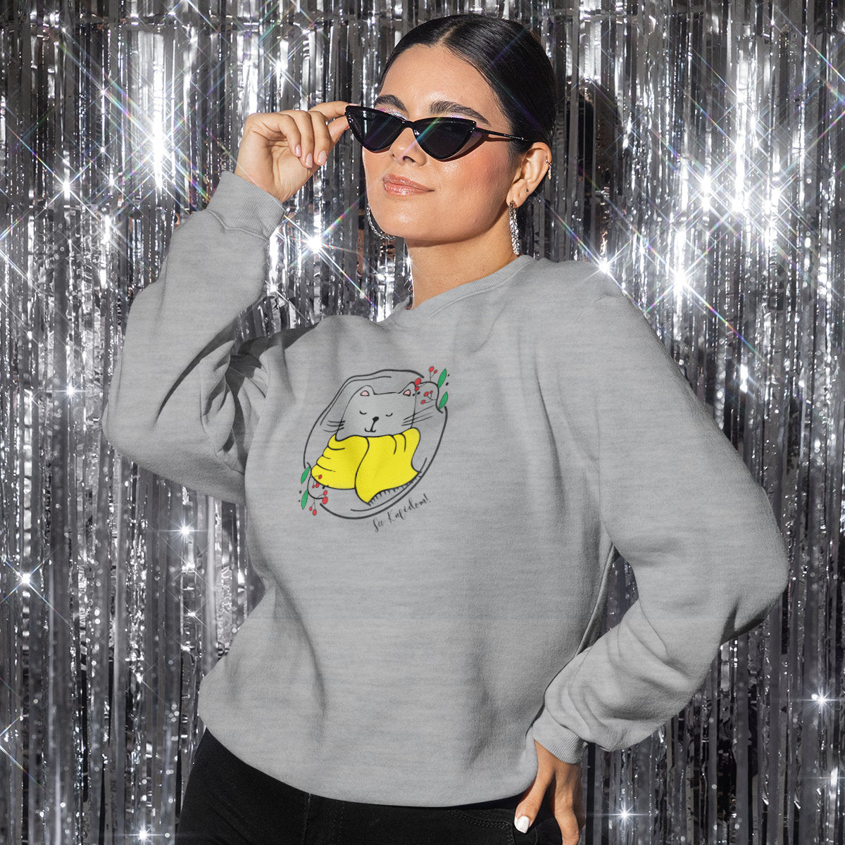 Pilkas UNISEX kalėdinis džemperis be gobtuvo "Katinas su geltonu šaliku"