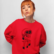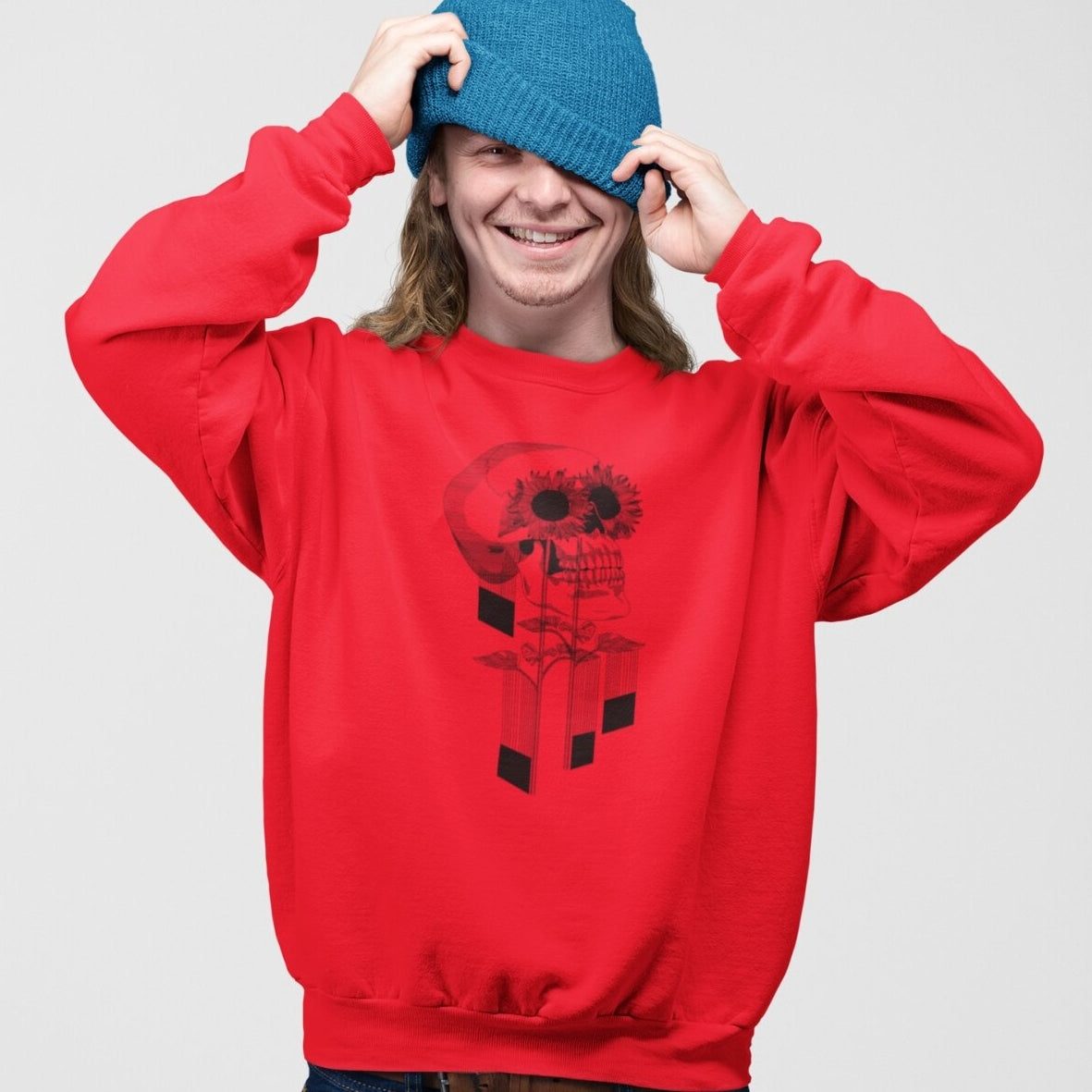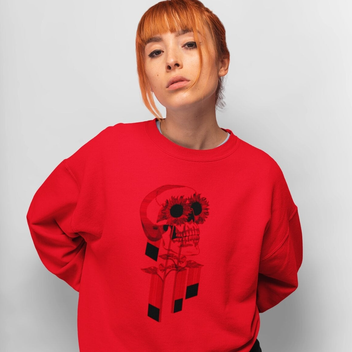 Raudonas džemperis be gobtuvo "Kaukolė su saulėgrąžom"