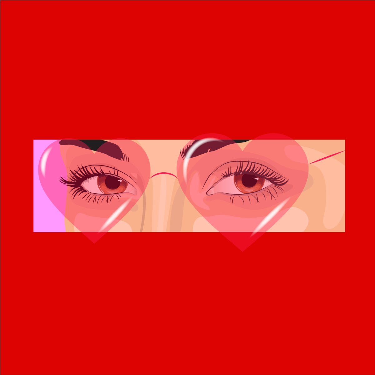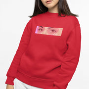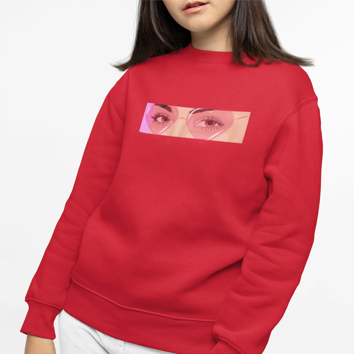 Raudonas džemperis be gobtuvo su spauda "Rožiniai akiniai"