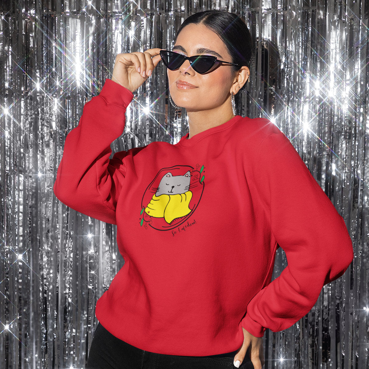 Raudonas UNISEX kalėdinis džemperis be gobtuvo "Katinas su geltonu šaliku"