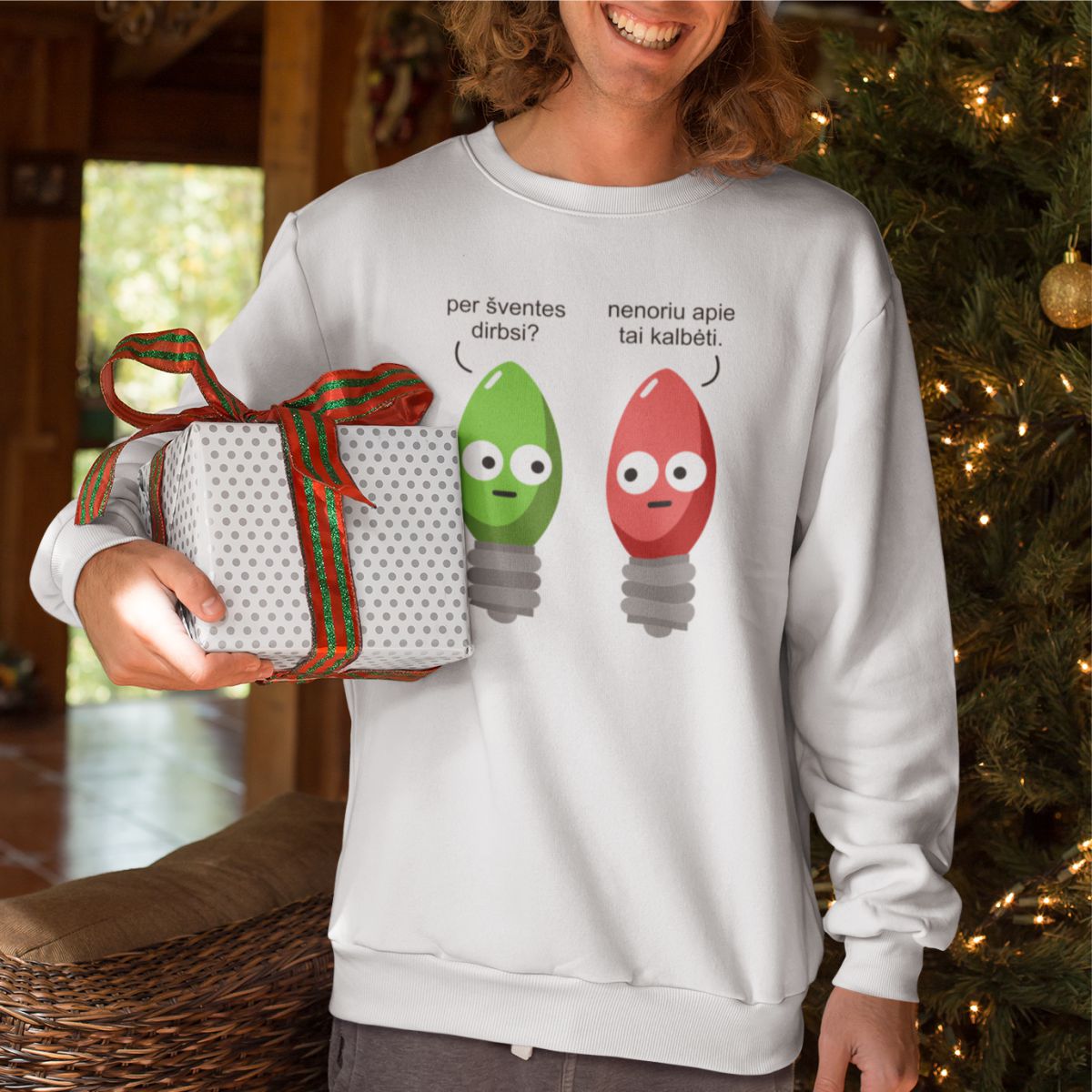 UNISEX baltas kalėdinis džemperis be gobtuvo "Lemputės"