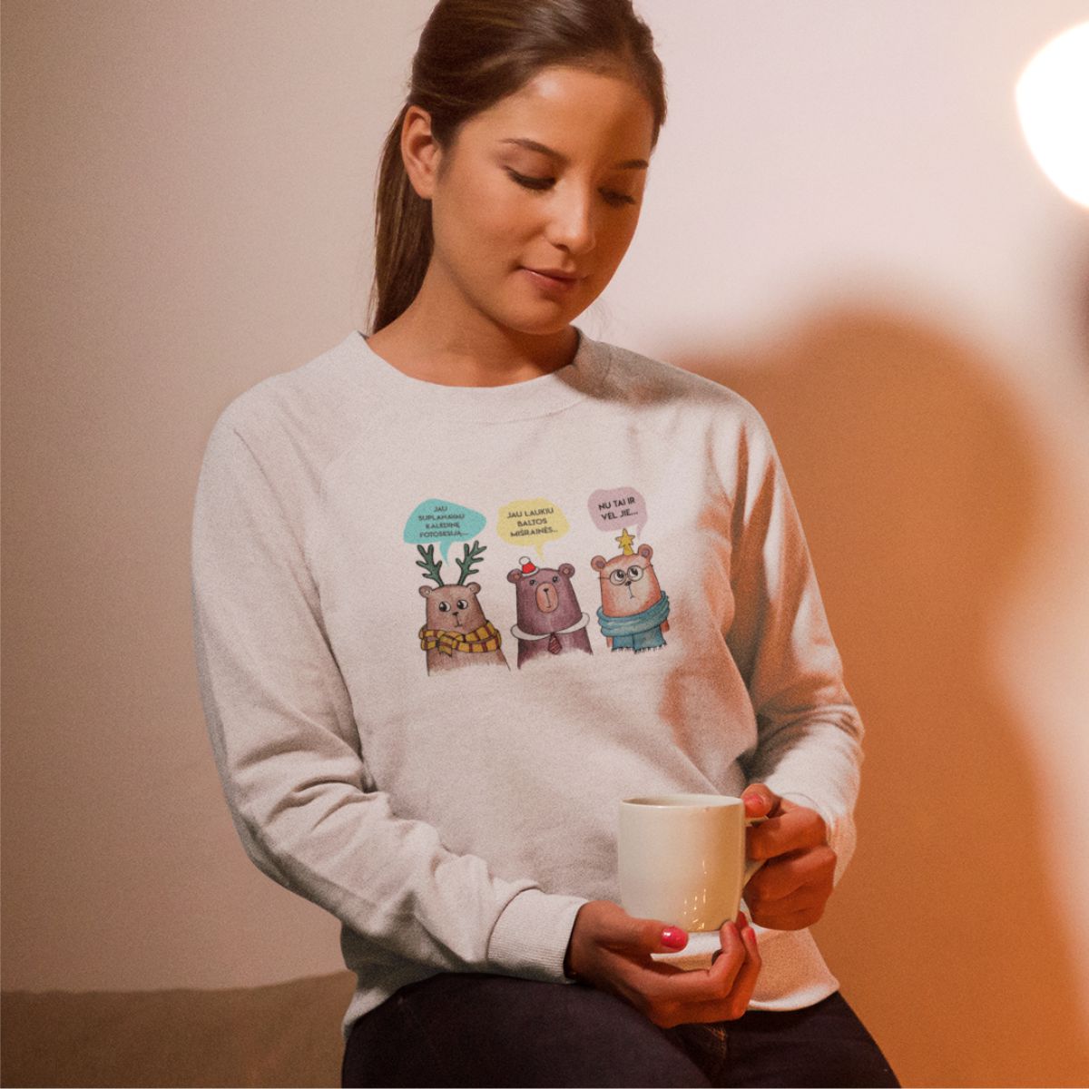 UNISEX baltas kalėdinis džemperis be gobtuvo "Trys meškinai"