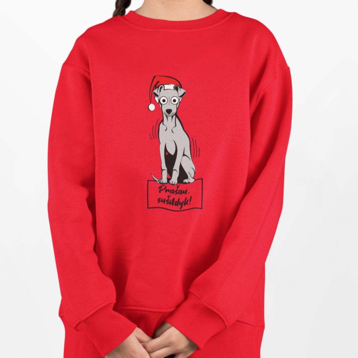 Vaikiškas raudonas kalėdinis džemperis "Prašau sušildyk"