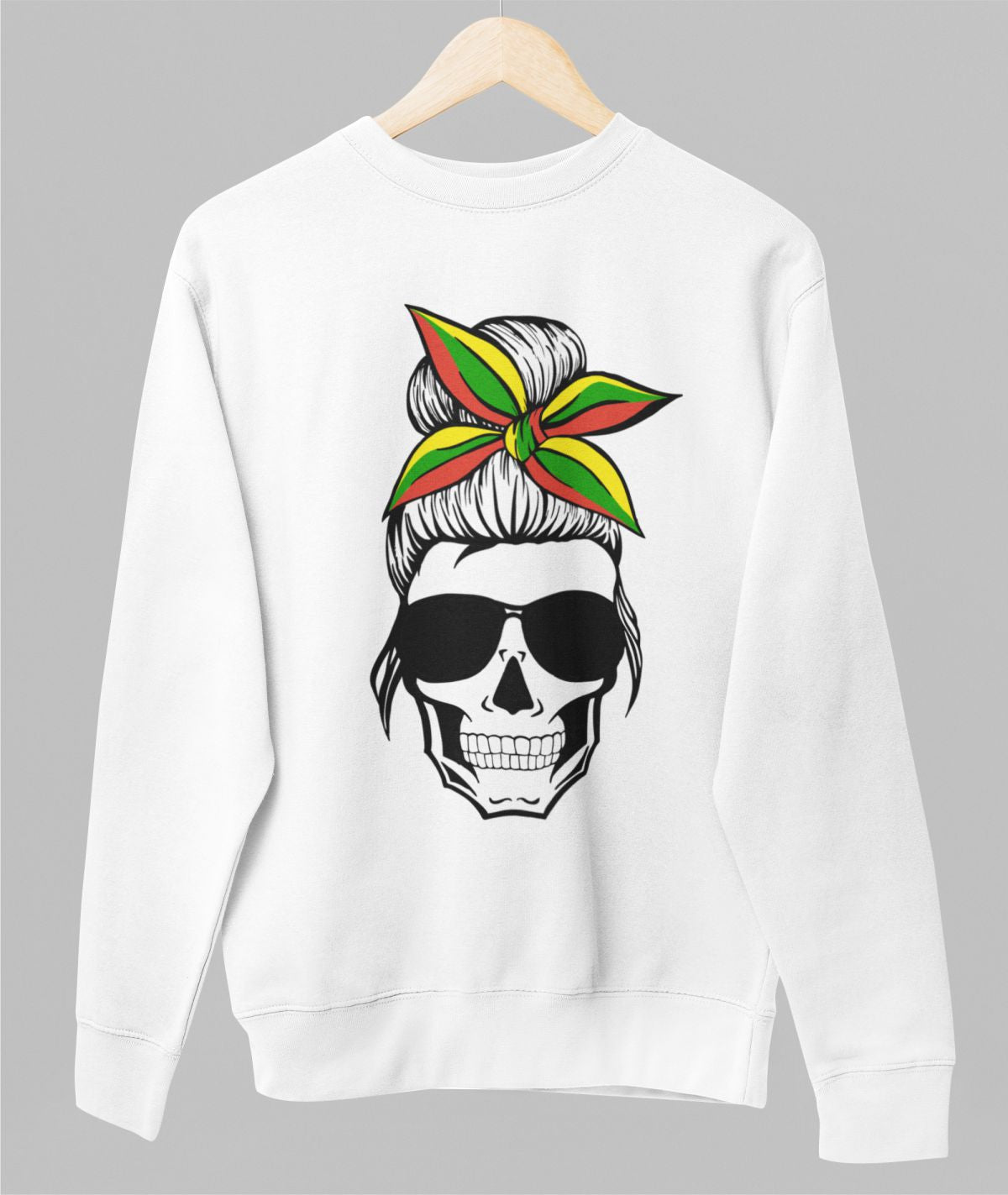 Baltas UNISEX džemperis be gobtuvo "Pin up kaukolė"