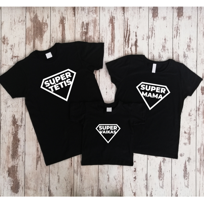 Medvilniniai marškinėliai su linksmais ir nuotaikingais piešinėliais visai šeimai "Super šeima". Nustebinkite artimus žmones, papuošdami juos išskirtinio dizaino marškinėliais!
