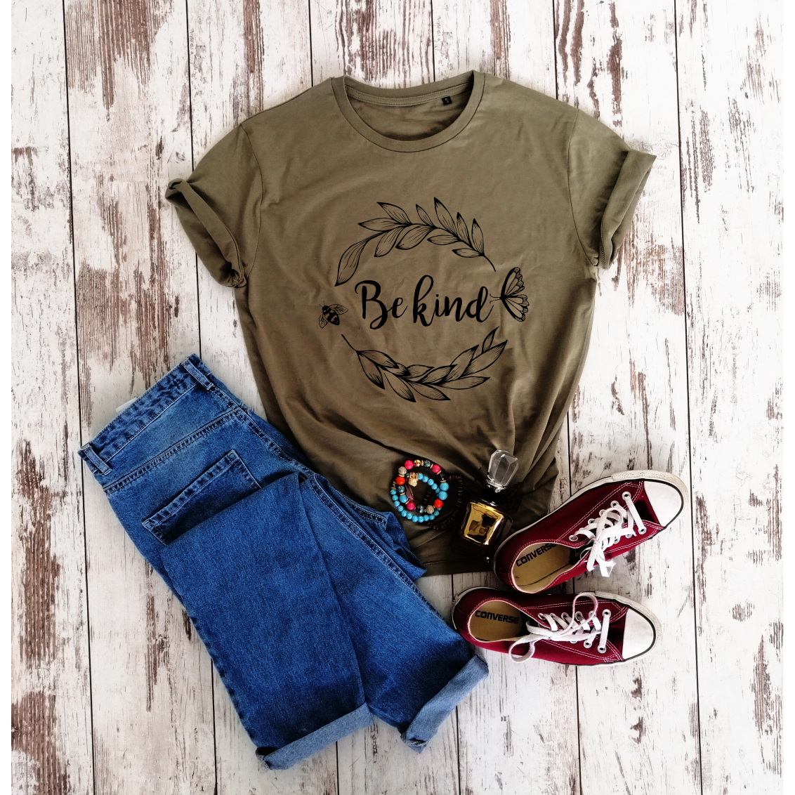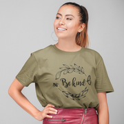 Khaki 100% medvilnės marškinėliai "Be kind"