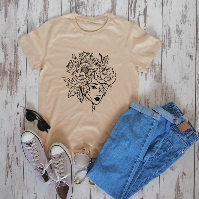 Smėlio spalvos ekologiškos medvilnės marškinėliai "Mergina iš gėlių"