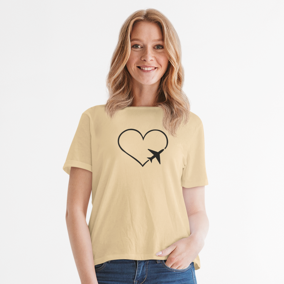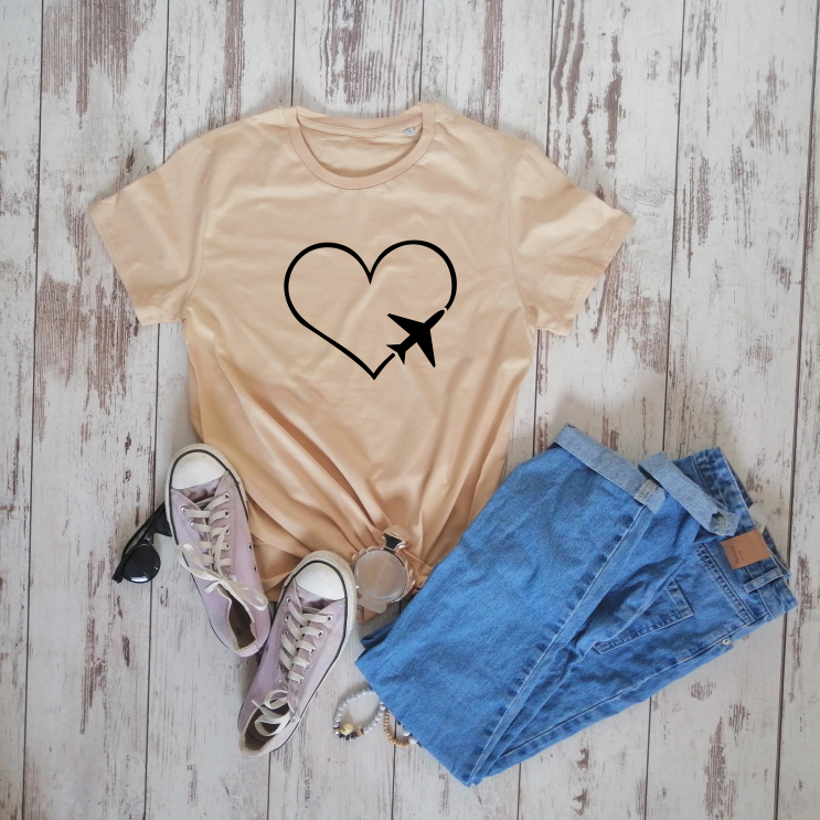 Smėlio spalvos ekologiškos medvilnės marškinėliai "Myliu keliones"