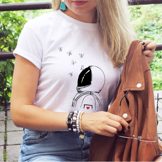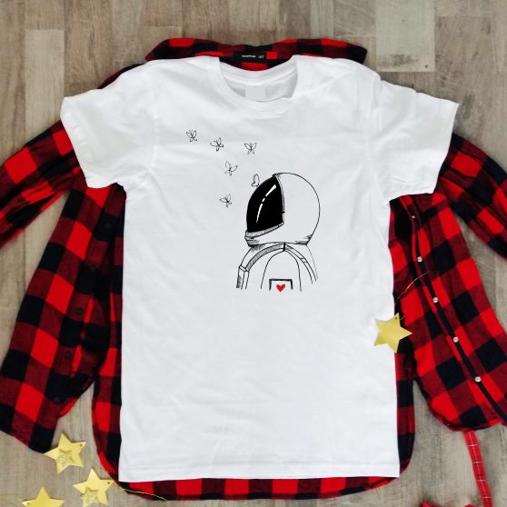 Balti medvilniniai marškinėliai "Kosmonautas tarp drugelių"