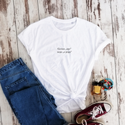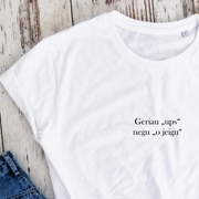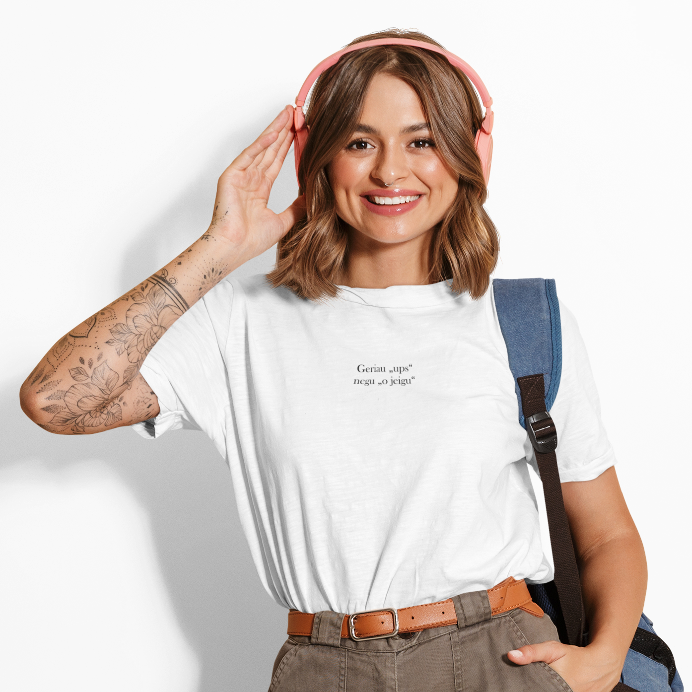 Balti ekologiškos medvilnės marškinėliai "Geriau ups" Pagaminta prekė (M)