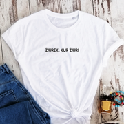 Balti 100% medvilnės marškinėliai "Žiūrėk, kur žiūri"