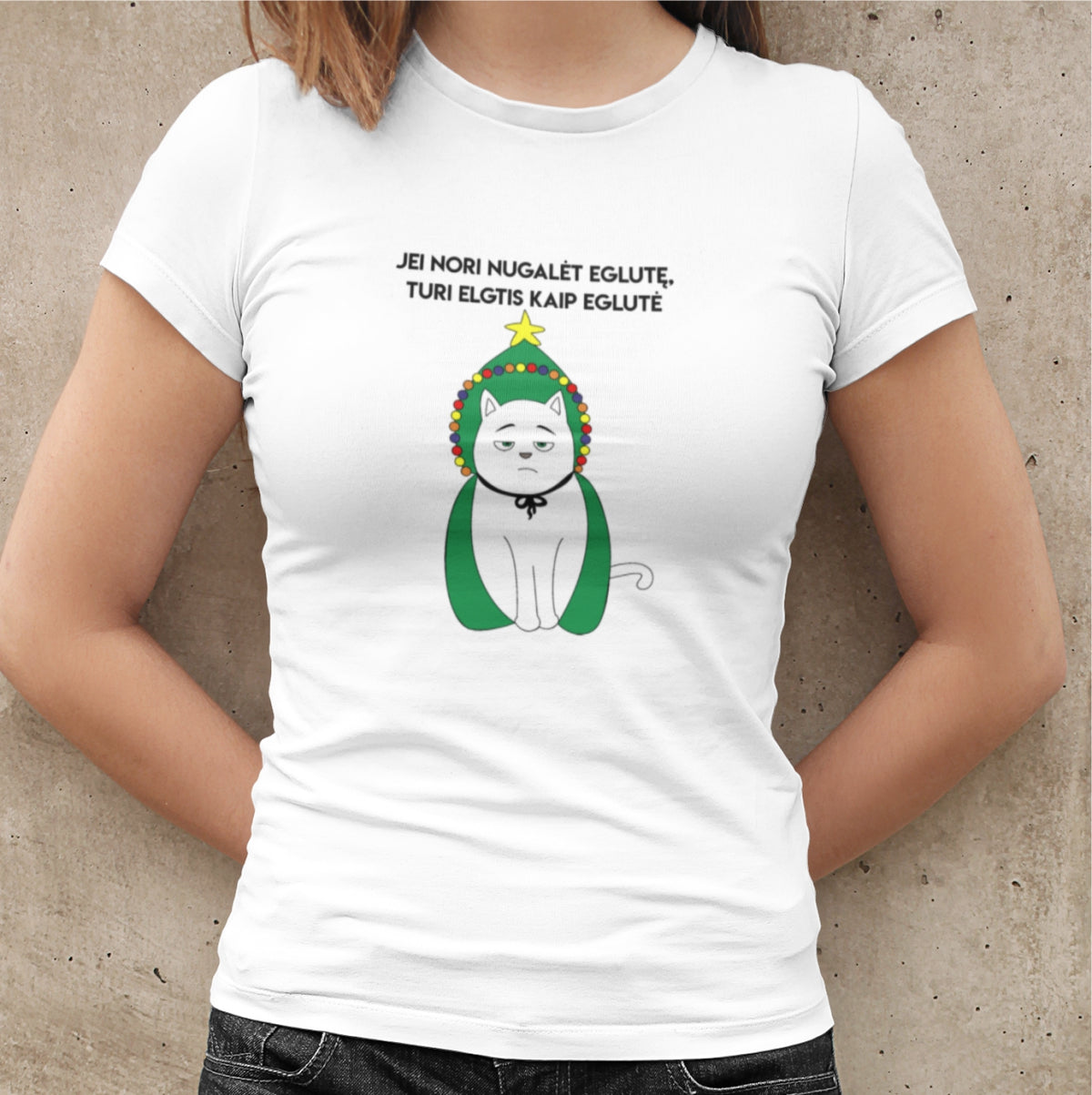 Balti kalėdiniai moteriški marškinėliai "Jei nori nugalėt eglutę"