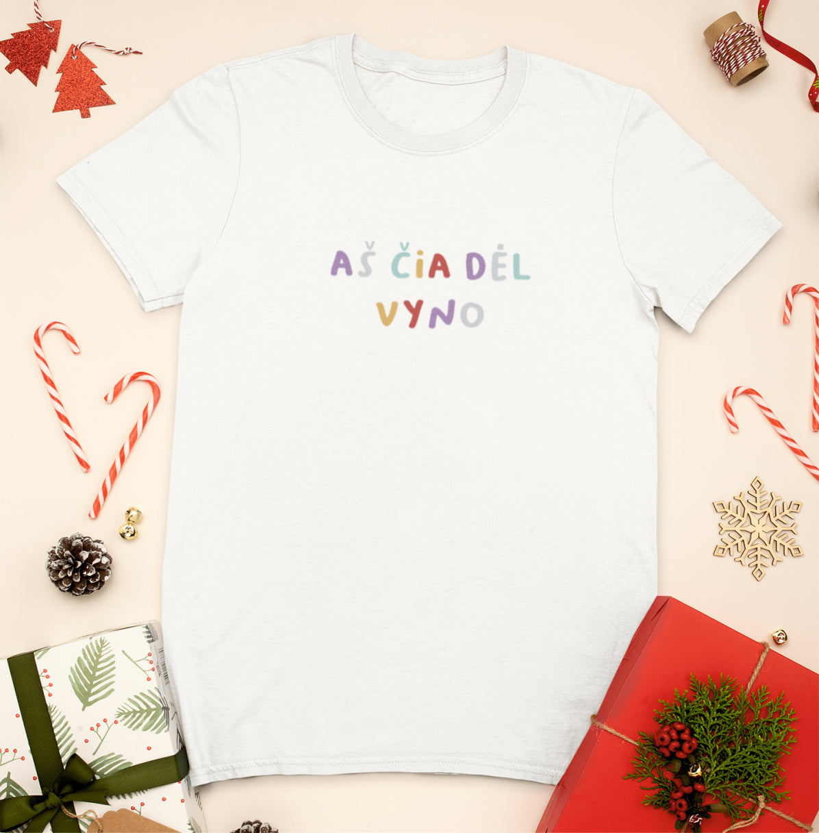 Balti kalėdiniai UNISEX marškinėliai "Aš čia dėl vyno"