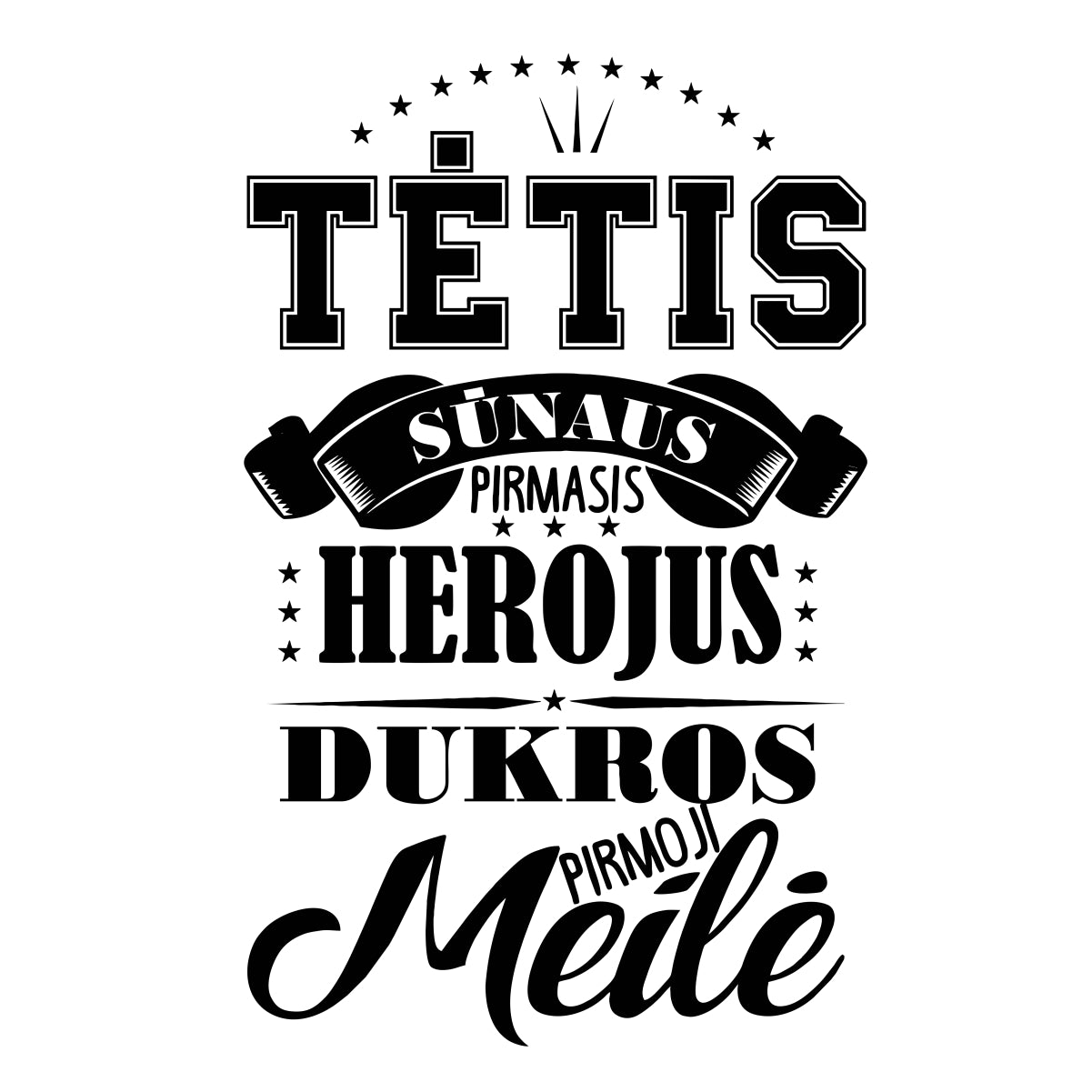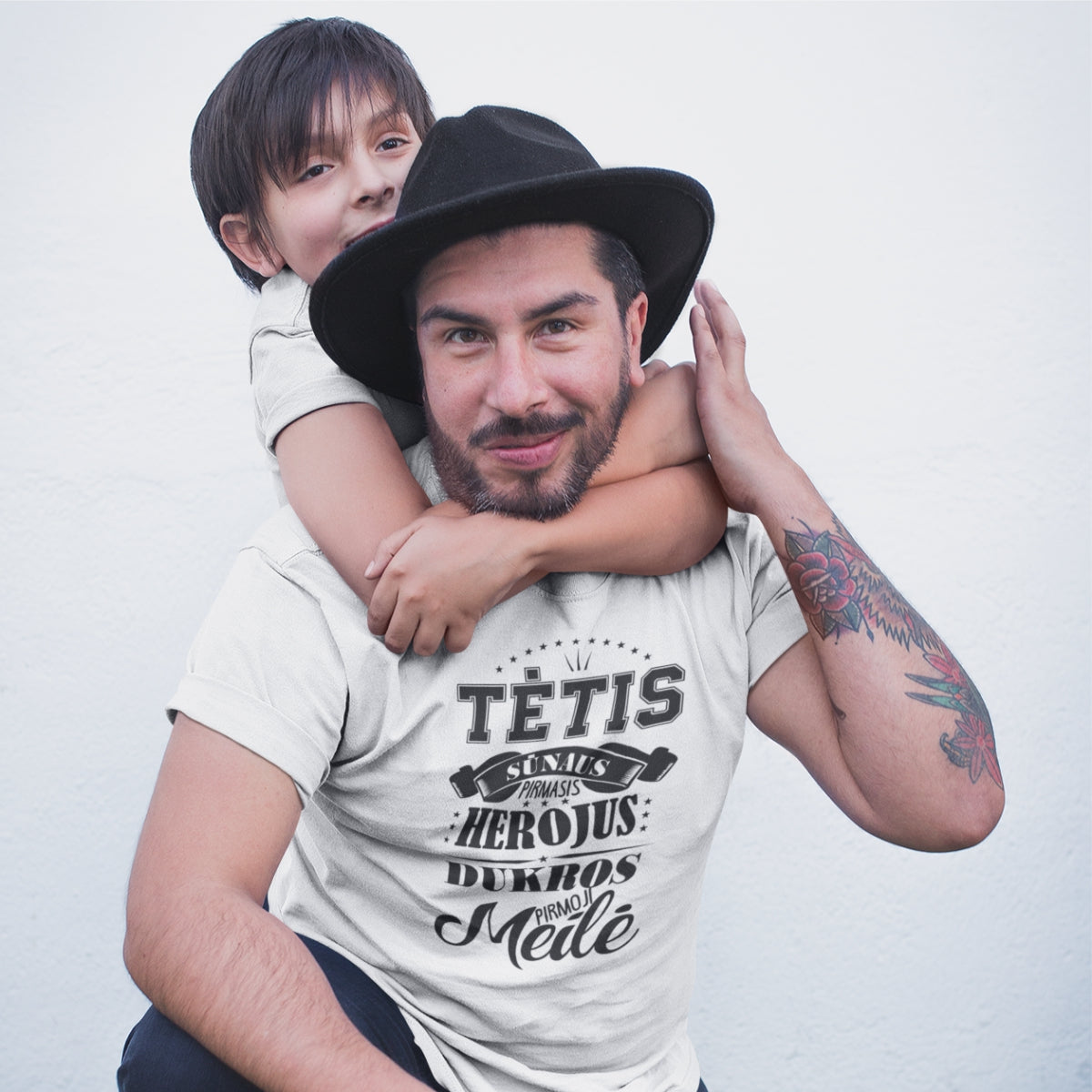 Balti marškinėliai su juodu užrašu "Tėtis herojus ir pirmoji meilė"