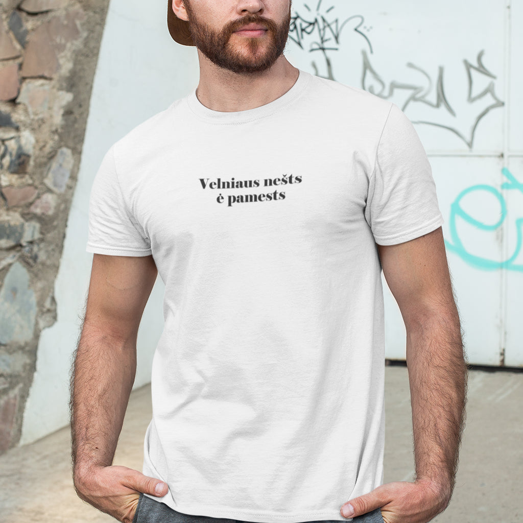 Balti marškinėliai su žemaitišku užrašu "Velniaus nešts ė pamests"
