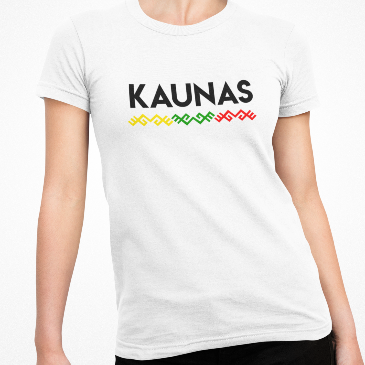 Balti moteriški marškinėliai ''Kaunas su tautiška juosta"